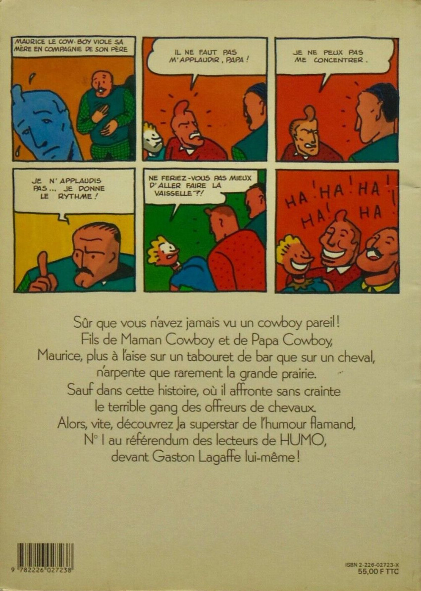 Etrange humour à la fois extrêmement lourd et si lourd qu’il en est efficace. Le gang des offreurs de chevaux n’est pas en lui-même terrifiant, et d’ailleurs rien n’est terrifiant dans cet album si ce n’est l’épaisseur de l’humour. Il s’agit d’un univers de total nonsense que crée Kamagurka, complètement débridé, sans aucune retenue. Bref, si l’intrigue est vide on ne s’en soucie pas et si le dessin est mauvais (quoi que) cela ne fait rien car l’essentiel est ailleurs, dans les enchaînements, les réparties, les dessins qui représentent efficacement l’esprit de l’auteur. En définitive on prend un vrai plaisir à suivre les aventures de ce cow boy niais (quoi de plus niais d’ailleurs que son nom : Maurice le Cow Boy) car les trouvailles abondent. En outre l’appétit est ouvert par les deux strips imprimés sur la quatrième de couverture qui sont un chef d’oeuvre de décalage vers le nonsense. Néanmoins la lourdeur l’emporte lorsque l’on relit plusieurs fois l’album et que l’on est moins surpris par l’histoire.BDGest 2014 - Tous droits réservés