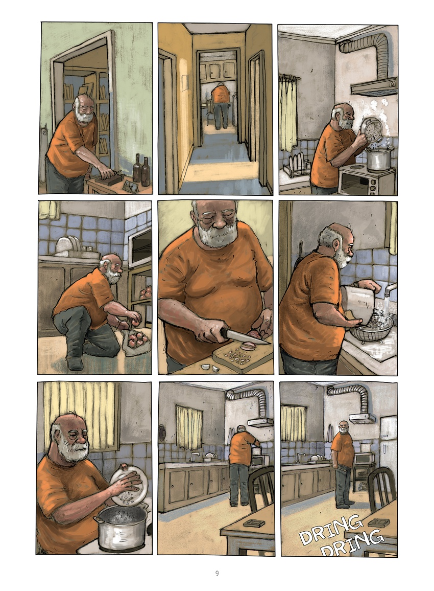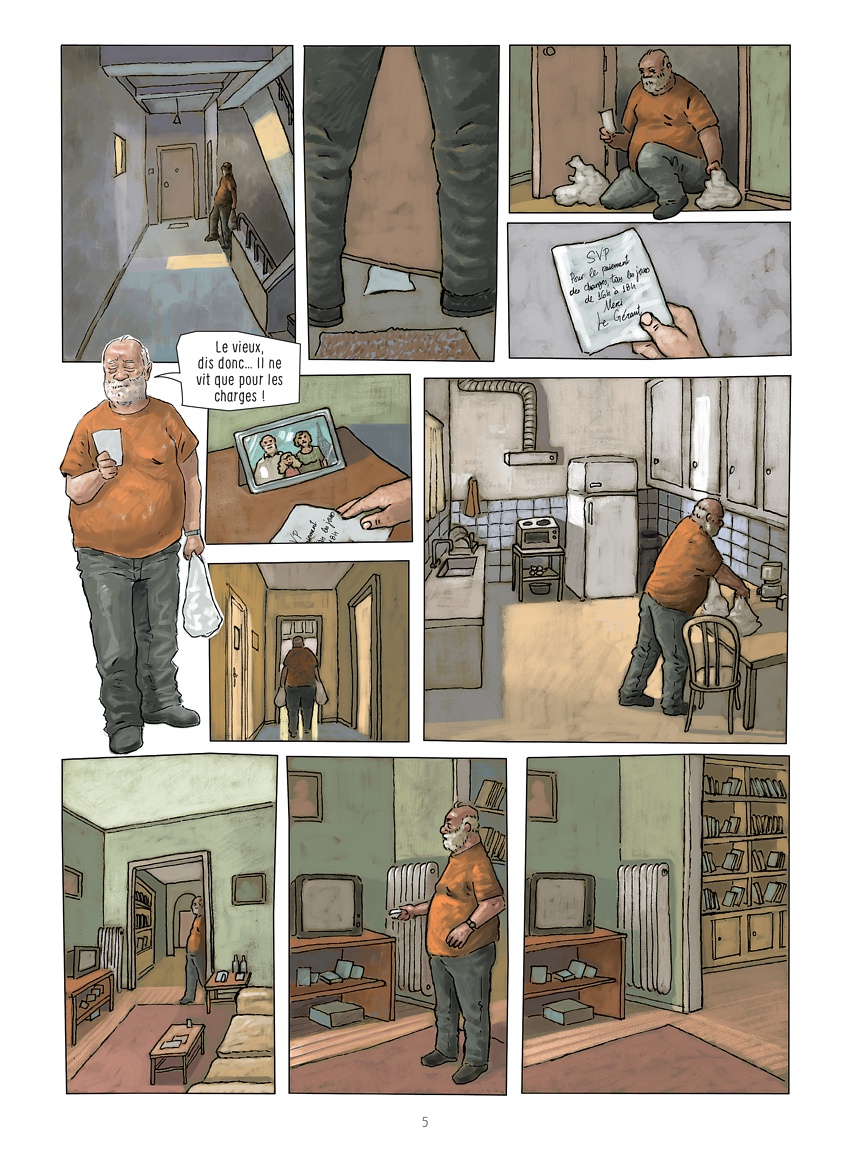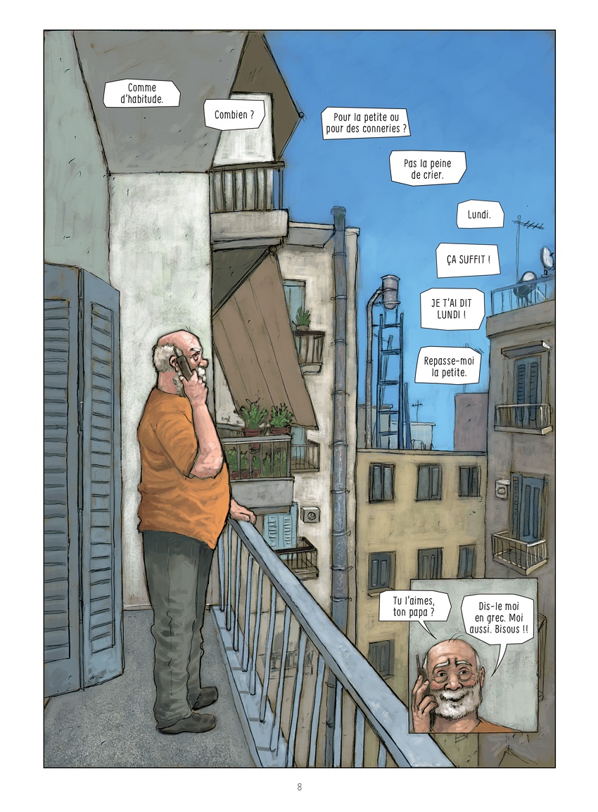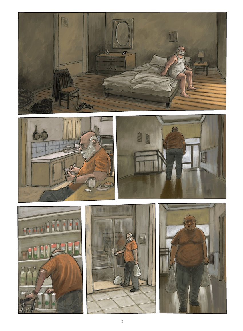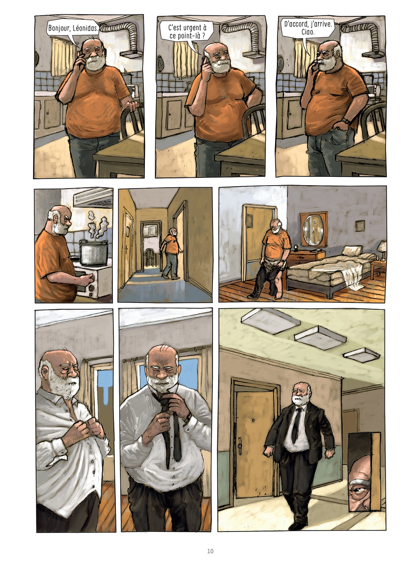 Sur le mode de la chronique sociale douce-amère, Tassos Zafriadis et Yannis Palavos racontent le début de la vieillesse au moment où l'individu réalise que le plus long du chemin est derrière soi. Leftéris est arrivé à l'âge où il n'a plus grand-chose à attendre. De plus, il est bien placé pour savoir qu'elle sera la prochaine étape. Néanmoins, il sait garder ses rancœurs et ses regrets pour lui ; de toute façon, il n'a pas le choix s'il veut garder son emploi. Le scénario, qui mise sur la simplicité et les non-dits, est adroitement ciselé et évite tout pathos ou voyeurisme. Sans effet de manche ou artifice inutile, les deux auteurs offrent un portrait profondément respectueux de leur personnage. Au final, plus réaliste que réellement pessimiste, le ton se révèle convaincant, particulièrement pour ceux qui sauront lire entre les cases.
