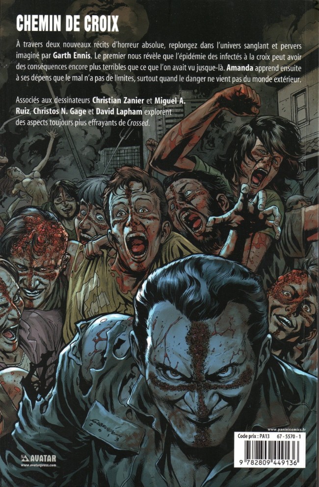 Info édition : Album à couverture à rabats, contenant deux histoires, "Collabo" (par Gage et Zanier, traduction des épisodes US "Crossed: Badlands" #29-32) et "Point de rupture" (par Lapham et Ruiz, traduction des épisodes US "Crossed: Badlands" #33-36), avec en bonus les couvertures originales (14 pages).