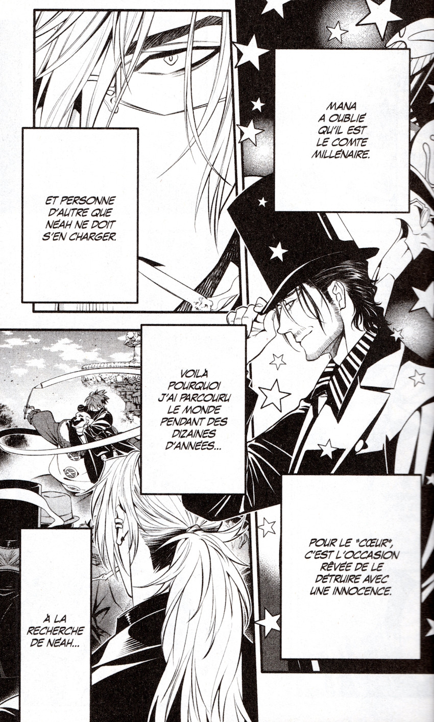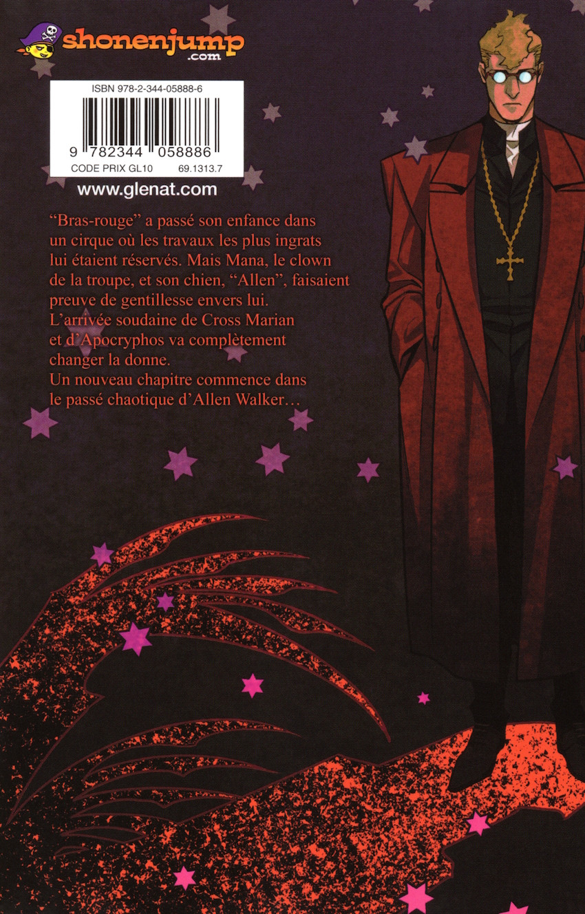 Résumé: Bras-rouge a passé son enfance dans un cirque où les travaux les plus ingrats lui étaient réservés. Mais Mana, le clown de la troupe, et son chien, Allen, faisaient preuve de gentillesse envers lui. L'arrivée soudaine de Cross Marian et d'Apocryphos va complètement changer la donne. Un nouveau chapitre commence dans le passé chaotique d'Allen Walker...
