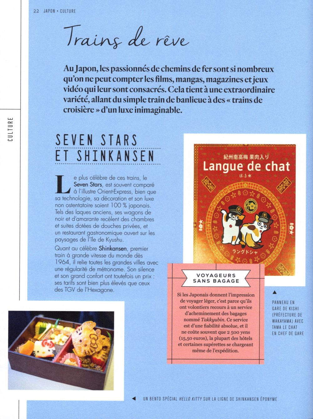 - Des doubles pages thématiques apportant un éclairage sur la culture du pays (les Japonais et la nature, la religiosité au Japon, les onsen, samouraïs et geishas…).
