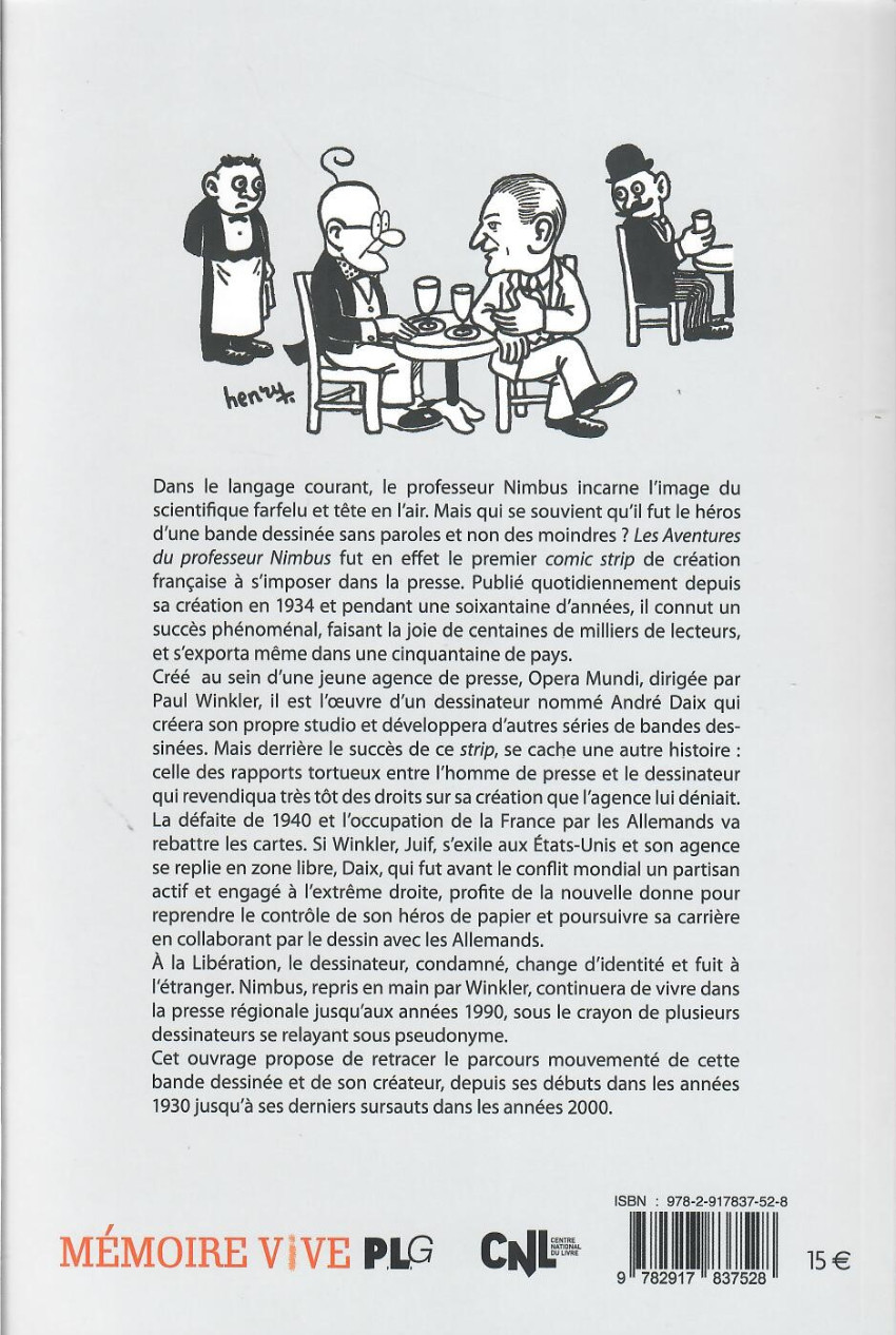 Résumé: Dans le langage courant, le professeur Nimbus incarne l'image du scien- tifique farfelu et tête en l'air. Mais qui se souvient qu'il fut le héros d'une bande dessinée sans paroles et non des moindres ? Les Aventures du professeur Nimbus fut en effet le premier comic strip de création française à s'imposer dans la presse. Publié quotidiennement depuis sa création en 1934 et pendant une soixantaine d'années, il s'exporta même dans une cinquantaine de pays. Créé au sein d'une jeune agence de presse, Opera Mundi, dirigée par Paul Winkler, il est l'oeuvre d'un dessinateur nommé André Daix qui créera son propre studio et développera d'autres séries de bandes des- sinées. Mais derrière le succès de ce strip, se cache une autre histoire : celle des rapports tortueux entre l'homme de presse et le dessinateur qui revendiqua très tôt des droits sur sa création que l'agence lui dé- niait. La défaite de 1940 et l'occupation de la France par les Allemands va rebattre les cartes.
