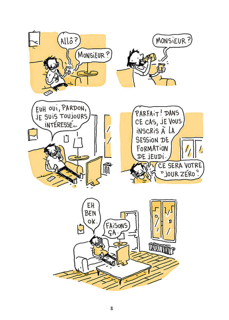 es petits boulots ingrats et mal payés, Lénaïc Vilain les connaît bien. Veilleur de nuit, agent de sécurité, etc., ces classiques jobs d’étudiants (ou d’auteurs de BD en devenir), il les a tous testés. Tous ? Pas si sûr, puisqu’un nouveau joueur gros consommateur d’intérimaires malléables à souhait s’est imposé ces dernières années, il œuvre dans la vente par correspondante. Après un énième entretien d’embauche raté, Lénaïc va avoir la joie d’embaucher chez Zamazon. En ces temps de pandémie, mieux vaut ne pas être trop exigeant, si on veut croûter et pouvoir payer son loyer.
