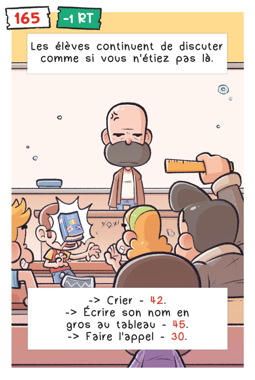 Jets de boulettes, bagarres, attaque de guêpes, ce jour de rentrée risque d’être mouvementé. Tentez de déjouer les pièges et les manigances des élèves, faites preuve d’humour, de perspicacité et de ruse, car le héros, c’est vous !