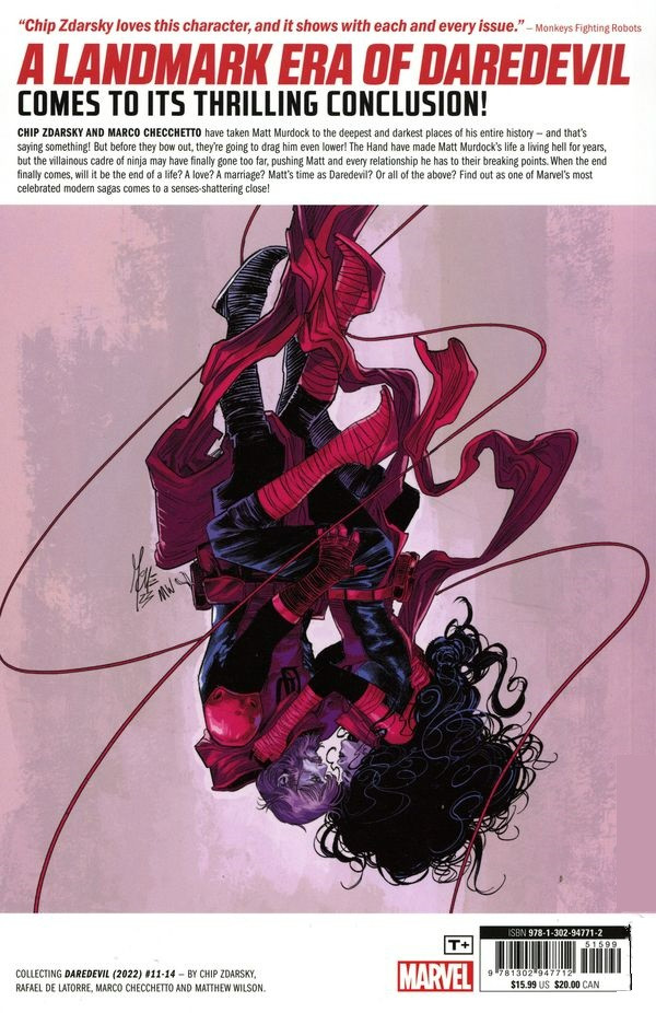 Résumé: A landmark era of DAREDEVIL comes to its thrilling conclusion! Chip Zdarsky and Marco Checchetto have taken Matt Murdock to the deepest and darkest places of his entire history - and that's saying something! But before they bow out, they're going to drag him even lower! The Hand have made Matt Murdock's life a living hell for years, but the villainous cadre of ninja may have finally gone too far, pushing Matt and every relationship he has to their breaking points. When the end finally comes, will it be the end of a life? A love? A marriage? Matt's time as Daredevil? Or all of the above? Find out as one of Marvel's most celebrated modern sagas comes to a senses-shattering close!