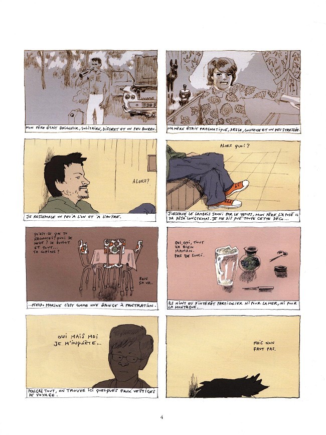 L’histoire se compose d’un long monologue. Wilfried Hildebrandt, le scénariste/narrateur – le récit est très largement autobiographique – raconte, tour à tour, son enfance, son arrivée dans la vie adulte et les relations qu’il entretient avec ses parents. Le ton est léger, rempli d’humour et de tendresse. Hildenbrandt parvient à extraire une réflexion plus générale de la plus petite anecdote. Si le côté pérégrination est particulièrement réussi, le final, une fois atteint le bout de la piste, arrive un peu brutalement. Cette rapide conclusion sous les étoiles du grand Nord, un peu en porte-à-faux avec le reste de l’album, peine à convaincre complètement.