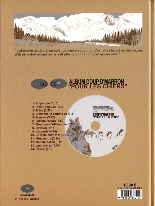 ouvent associées, la BD et la musique sont des compagnons de route de longue date. Cosey donne des conseils d’écoute pour sa série Jonathan, des coffrets BD + disque sont présents dans les catalogues des éditeurs et, c’est sans compter, les nombreux groupes amateurs composés d’auteurs qui se forment et se déforment au fil des ans. L’association culturelle pour la chanson francophone actuelle (ACCFA) lance la collection Zik & Bulles. L’idée est de promouvoir une nouveauté discographique avec un album de BD partageant une thématique commune. Dans le cas présent, le lien est encore plus fort, Wilfried Hildebrandt est, en effet, à la fois le chanteur de Coup d’Marron et le scénariste de Le Nord c’est pas fait pour les Chiens !