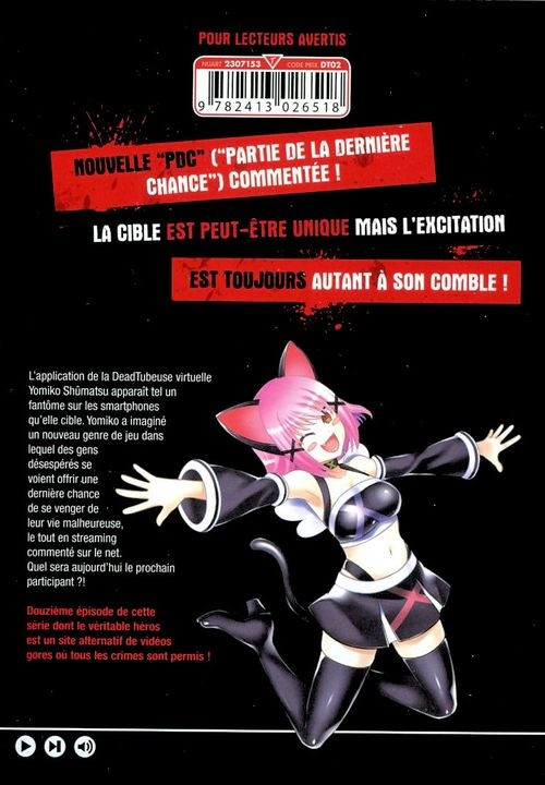 Résumé: Dead Tube. Les jeunes gens n'ont plus que ce nom de site de partage de vidéos à la bouche. En fonction du nombre de vues, il peut rendre n'importe qui incroyablement riche. Mais seules les vidéos les plus trash, les plus humiliantes ou dangereuses intéressent les gens. Accepter d'y participer, c'est prendre le risque de finir dernier et d'endosser tous les crimes réalisés par les autres prétendants. C'est à ce jeu morbide que vont jouer Mai et Tomohiro...