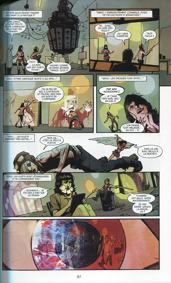 Avec un pitch pareil, doublé d’une couverture qui en met plein la vue, on se prend rapidement à rêver d’un truc qui dépote complètement, qui arrive sur le marché comme un tsunami, emportant tout sur son passage. Et l’entrée en matière est plutôt à la hauteur, en fait : des personnages un peu dingues, du nihilisme assumé, de la violence crue… le tout enrobé d’un dessin qui a du chien, avec un trait bien inspiré et des couleurs psychédéliques à souhait. La surenchère est toutefois à craindre quand les choses démarrent comme ça, sur les chapeaux de roues. Malheureusement, Death Sentence n’y échappe pas. Rapidement, les héros torturés finissent par sonner creux, la vulgarité se fait facile et, l’esprit embrouillé, le lecteur finit par tourner les pages sans trop s’accrocher à ce qui se déroule sous ses yeux. Un final réussi ne vient pas contrebalancer l’usage un peu trop flagrant de grosses ficelles, de même que l’attachement aux différents protagonistes n’est pas poussé jusqu’au bout. En témoigne une scène qui se veut poignante, mais qui, attendue, paraît finalement bien terne.