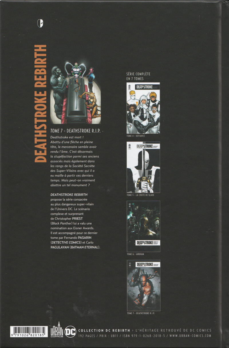 Résumé: Deathstroke est mort ! Abattu d'une flèche en pleine tête, le mercenaire semble avoir rendu l'âme. C'est désormais la stupéfaction parmi ses anciens associés mais également dans les rangs de la Société Secrète des Super-Vilains avec qui il a eu maille à partir ces derniers temps. Mais peut-on vraiment abattre un tel monument ?