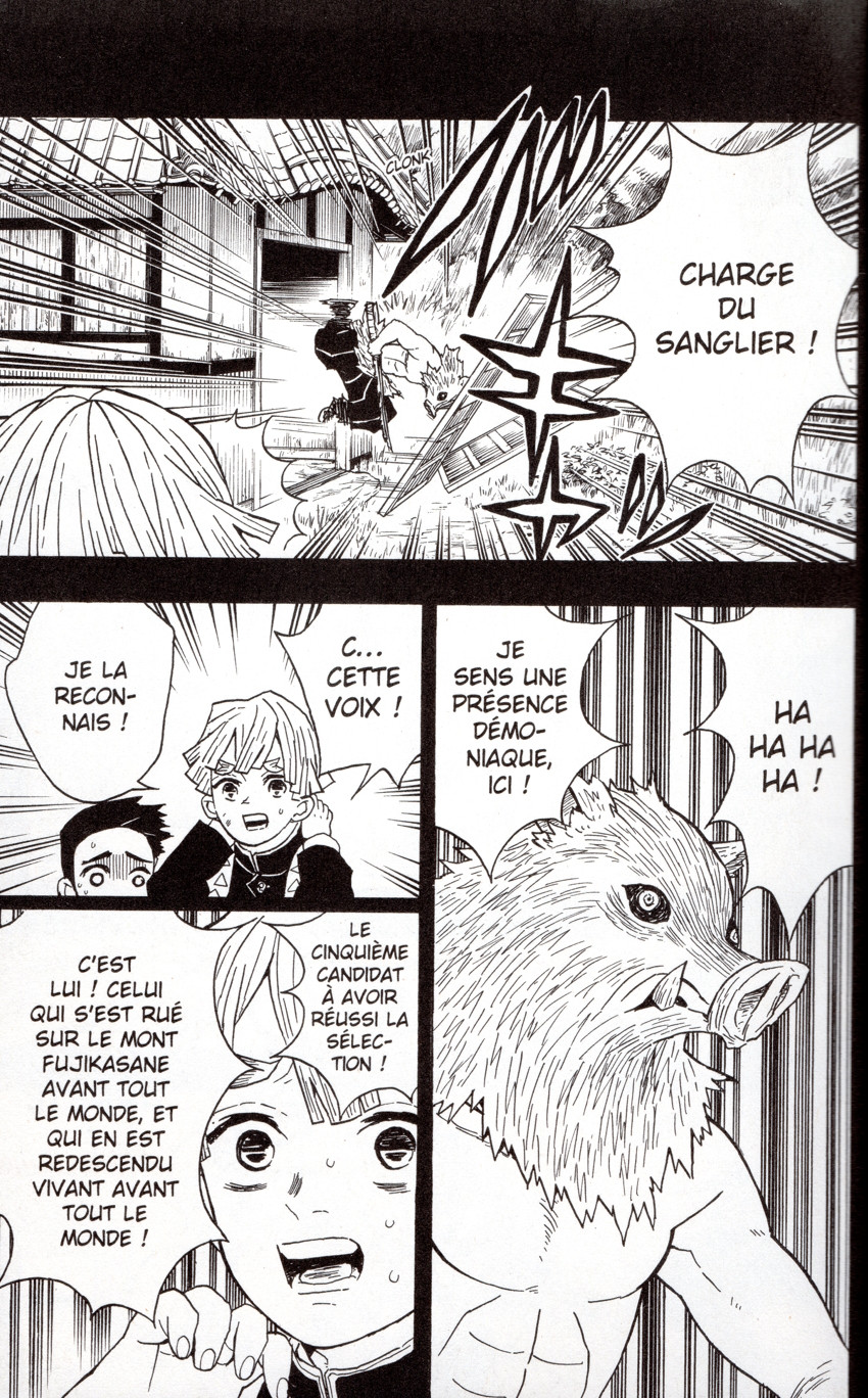 Résumé: Alors qu'il sort victorieux de son combat contre le démon aux tambours, Tanjiro découvre Zenitsu en train de se faire rouer de coups par un étrange personnage. Portant un masque représentant la tête d'un sanglier, cet adversaire téméraire est en fait un nouvel ami ! Nos trois héros sont ensuite envoyés dans une mystérieuse forêt où d'innombrables toiles d'araignée tissent une atmosphère tendue et inquiétante... Que vont-ils y découvrir ?