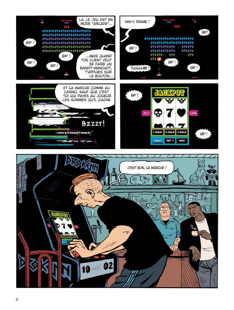 Depuis un moment, mon libraire insiste pour me faire lire « le dernier Atlas », une pépite selon lui. Je l’ai feuilleté puis reposé. Cela ne me disait rien. Et puis, je suis tombé dessus à la médiathèque et j’ai commencé à le lire pour vraiment m’en faire une idée et je ne l’ai plus lâché ! Le début de cette histoire est pourtant assez banal : un petit truand de Nantes, Ismael Tayeb qui magouille dans les machines à sous. On pourrait facilement tomber dans le polar avec une guerre des gangs, que nenni ! De mystérieuses migrations d’animaux dans le désert algérien viennent bouleverser la vie de Tayeb. Autour de Tayeb, gravite une galerie de personnages assez étonnants : Martin et Jean Legoff pour la pègre, Françoise, l’ancienne journaliste au « canard enchainé », sans oublier les anciens du « George Sand », le dernier Atlas, robot hors norme dédié à la construction. Sur les conséquences de la fin de la guerre d’Algérie, cet album nous entraine en fin de compte dans une uchronie française étonnante, qui finalement nous est révélée dans le dossier présent à la fin de l’album. J’ai suivi avec une certaine fascination l’histoire de Tayeb, qui au fil des chapitres, s’affirme de plus en plus et finit par s’émanciper de la pègre nantaise. Ce premier opus de cette série (qui en comptera 3) est littéralement addictif. J’en ai pour preuve que mon fils m’a emprunté, à son tour cet album, et lui qui lit rarement des bd, l’a dévoré d’une traite. Les auteurs confirmés (Vehlman, de Bonneval, Tanquerelle & Blanchard) nous livrent là une histoire digne des meilleures séries TV : aucun temps mort, on passe d’un personnage à l’autre, d’un continent à l’autre avec une facilité déconcertante de lecture. Après avoir lu ce premier opus dans sa version standard (en couleur), j’ai finalement acheté la version noir et blanc , en tirage limité, de canal bd. Cette version est splendide (ce qui n’enlève rien au travail remarquable de la coloriste, Laurence Croix) et met en valeur le dessin d’Hervé Tanquerelle, que je rapproche ici du dessin de Frédéric Peeters, période « RG », comme le souligne également Jérôme Briot dans le magazine Zoo (mars/avril 2019). J’ai lu que canalbd allait continuer à éditer les deux volumes suivant en noir et blanc, je m’en réjouie d’avance. Cet album est une des meilleurs sorties de ces derniers mois, et tranche avec la production actuelle. Dépaysant, original et addictif, bref une réussite.Le 23/03/2019 à 10:09:23