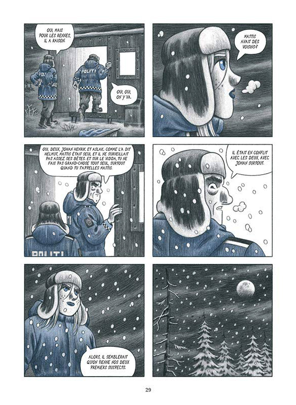 Cette adaptation du roman d’Olivier Truc par deux auteurs espagnols est une belle surprise. Le scénario de Javier Cosnava respecte ce qui faisait la particularité de l’œuvre originelle, à savoir un polar à l’intrigue solide dans un contexte (une ethnie lapone) original et peu connu. Ce dernier point est essentiel car, ici, l’environnement n’est pas une simple toile de fond sommairement décrite, mais, bien au contraire, il constitue un élément totalement intégré à l’histoire. Ainsi, tout en suivant des personnages intéressants dans une enquête passionnante, le lecteur découvre une peuplade qui tente de préserver ses territoires et son mode de vie ancestral face au capitalisme sauvage (la région est riche en minerais) et au suprémacisme de l’extrême-droite. Cette immersion dans cette culture se fait au fil de l’eau, sans jamais avoir recours à des récitatifs lourds ou des dialogues plombant le rythme du récit.