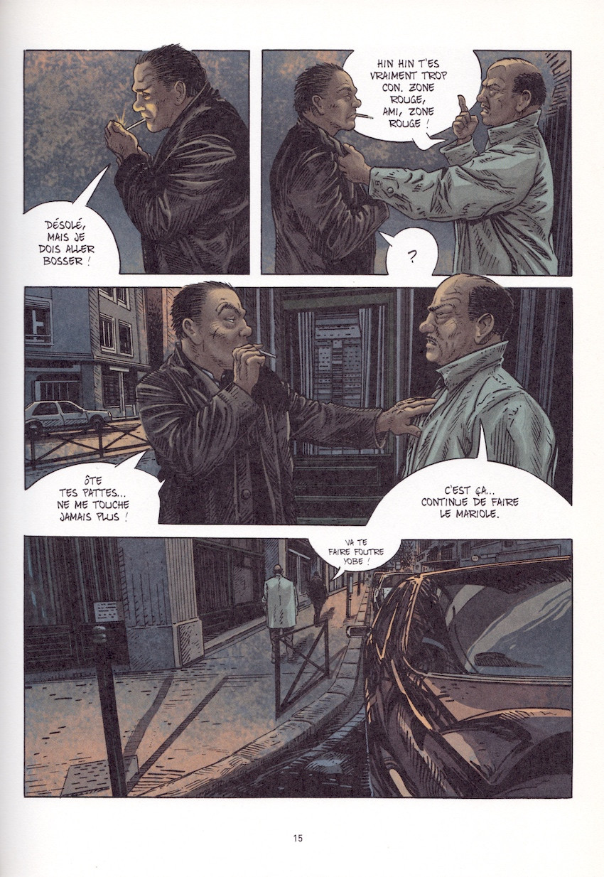 Cette reprise du roman d’Hugues Pagan, ancien de la maison Poulaga, parvient à en restituer avec fidélité deux éléments importants : l’atmosphère, d’une part, d’une noirceur absolue, et de l’autre, le rythme très saccadé de la narration, presque déstabilisant pour le lecteur. Ce dernier point n’a rien d’anodin, car il constitue bien le témoin improbable de l’existence ici rapportée. Bossant en Brigade de nuit depuis des lustres, il s’est progressivement détourné du réel pour intégrer, sans s’en rendre bien compte, une sorte de cauchemar cyclique, ce qui ne l’aidera pas à affronter celui qu’il fuit comme la peste. Ce rythme, complètement décousu, potentiellement déconcertant, est pourtant rapporté avec justesse : implacablement, les temps de permanence se succèdent avec la régularité d’un métronome, implacablement, l’imprévu frappe sans prévenir avec tout ce qu’il a d’intrinsèquement violent. Échec de la méthode, la descente aux enfers parait sans fond.