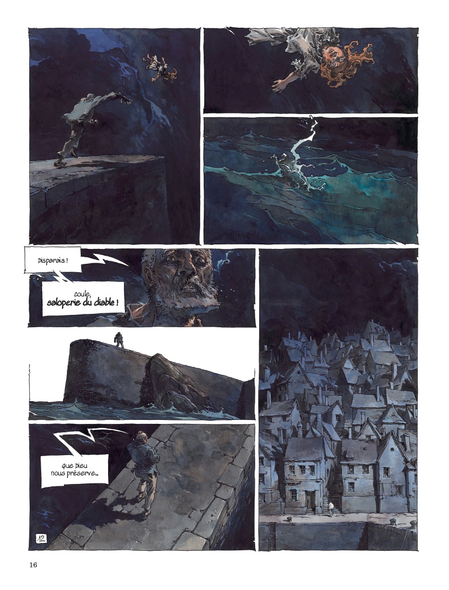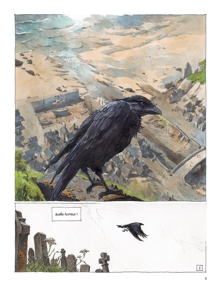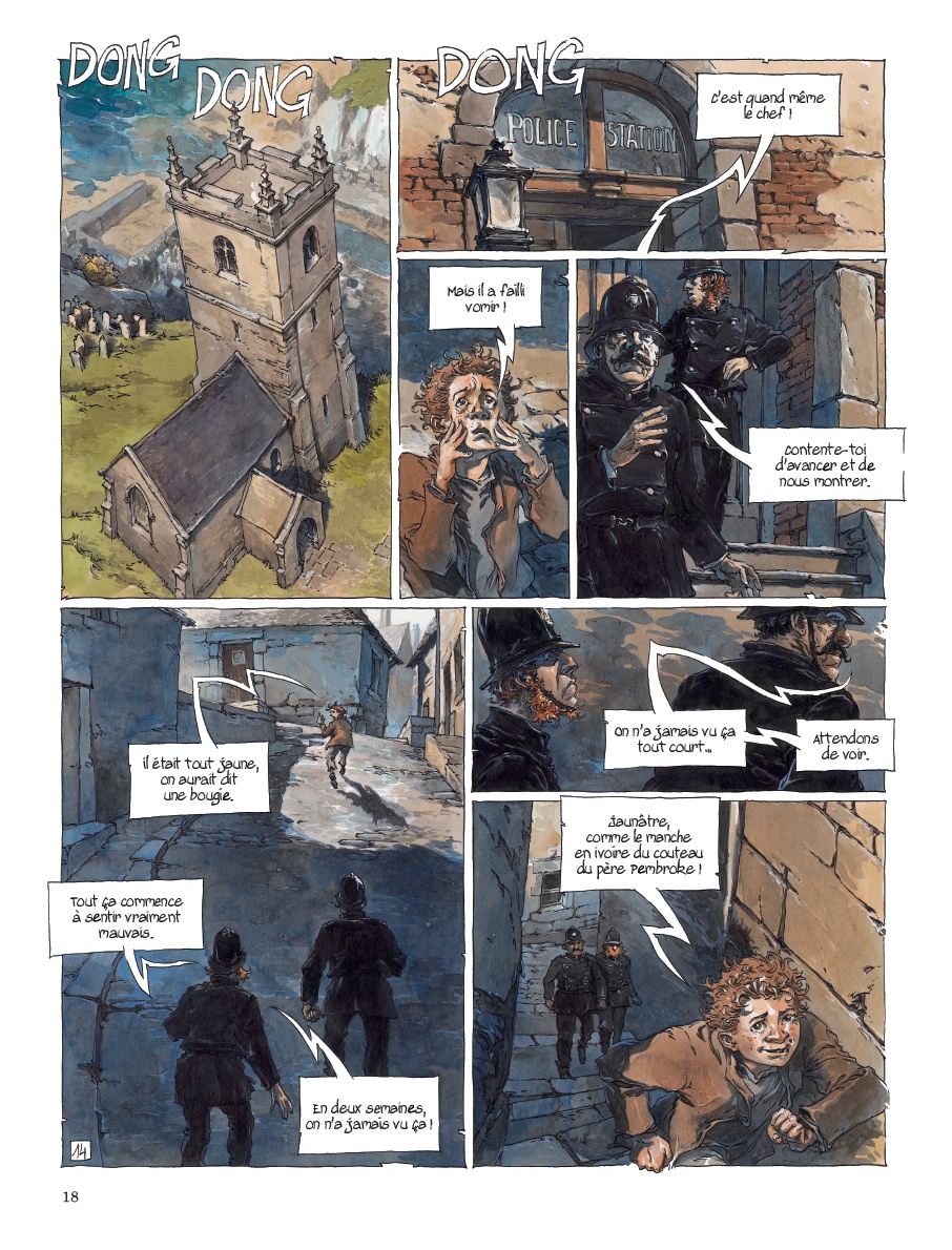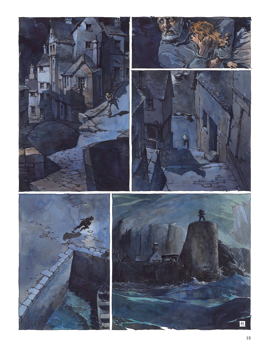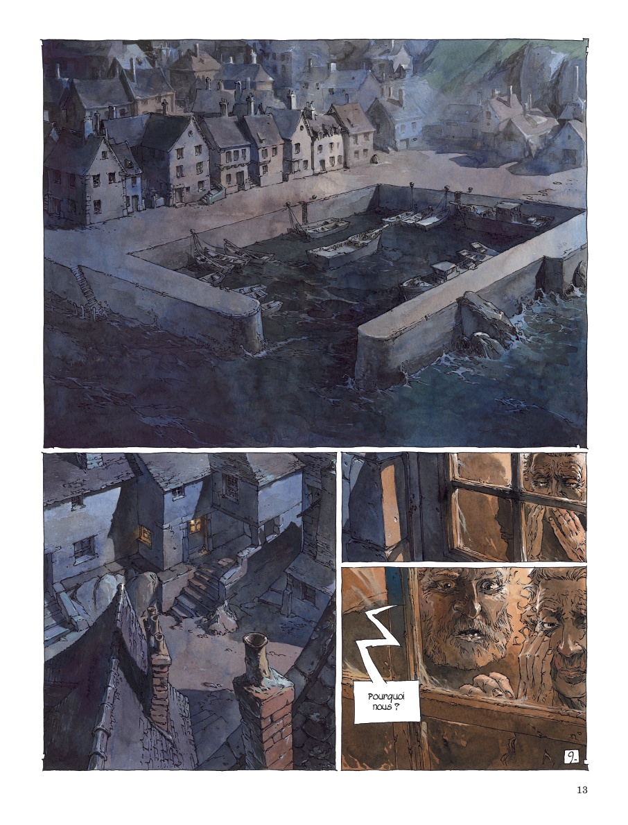Résumé: Le long de la côte galloise, un village est la proie d'une série de crimes inexplicables. Le personnage central – amateur de littérature fantastique – fait progressivement la connaissance d'une étrange jeune fille alternant douceur et furie. Le finale se déroule dans une demeure envoûtante pourtant supposée avoir été ravagée par le feu. La jeune fille se vengerait-elle des villageois qui ont refusé de porter secours à ses parents ? Une captivante réflexion sur les techniques que la BD offre pour transmettre le sentiment de « peur » et les mises en scène possibles de cette dernière. Sorel rend hommage à Arthur Machen, un de ses romanciers favoris ; toute la campagne, les forêts qui entourent ce petit village portuaire maudit s'inspirent des textes de cet auteur gallois. Un projet de plus de vingt ans prend ainsi forme en regroupant toutes sortes de références et de réflexions sur la mise en scène de la peur !