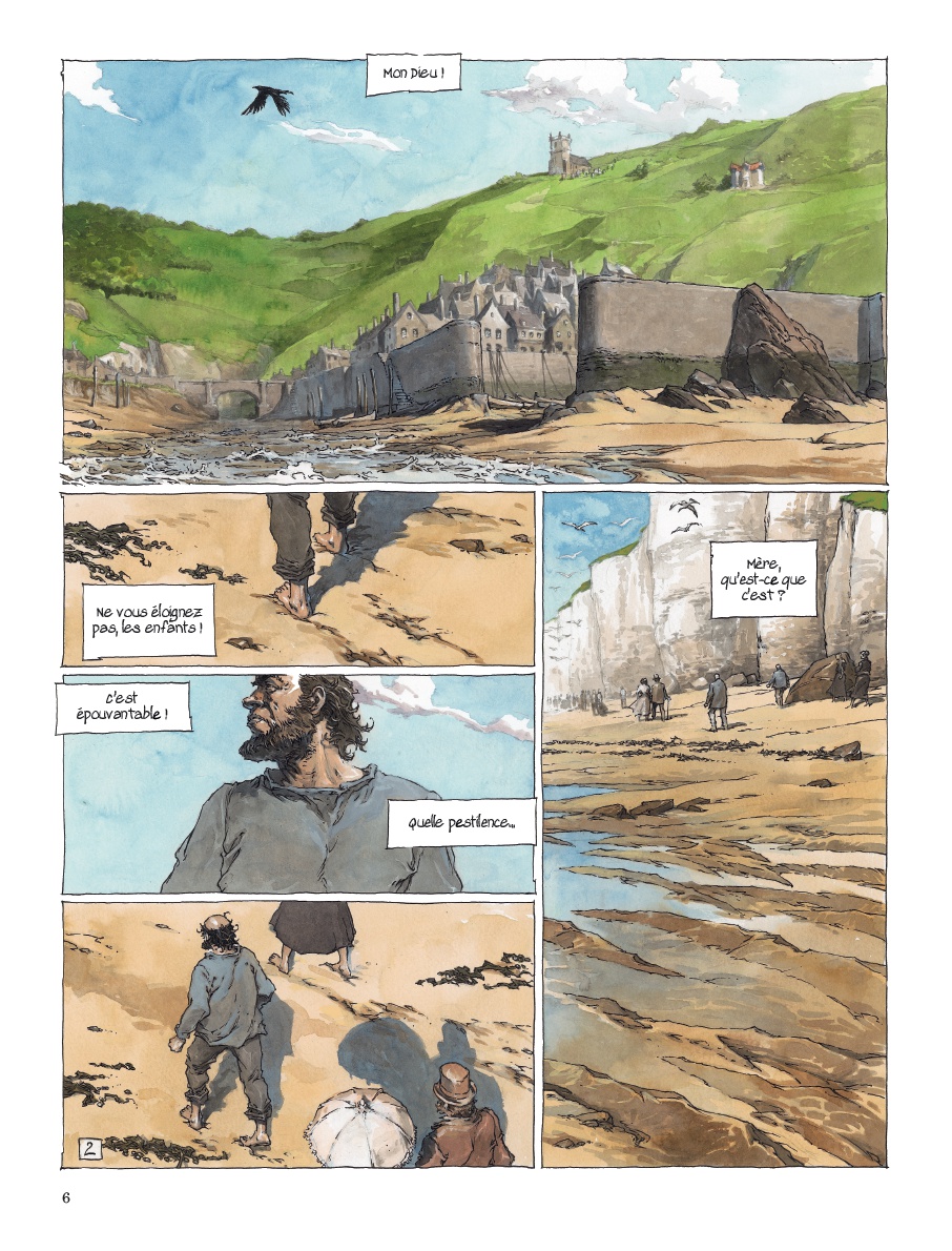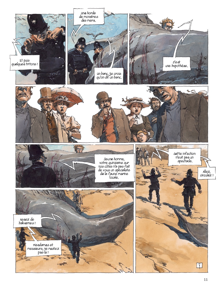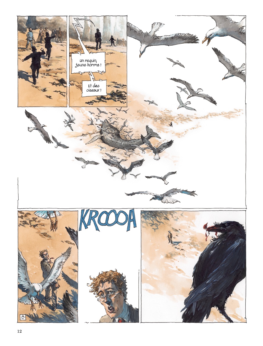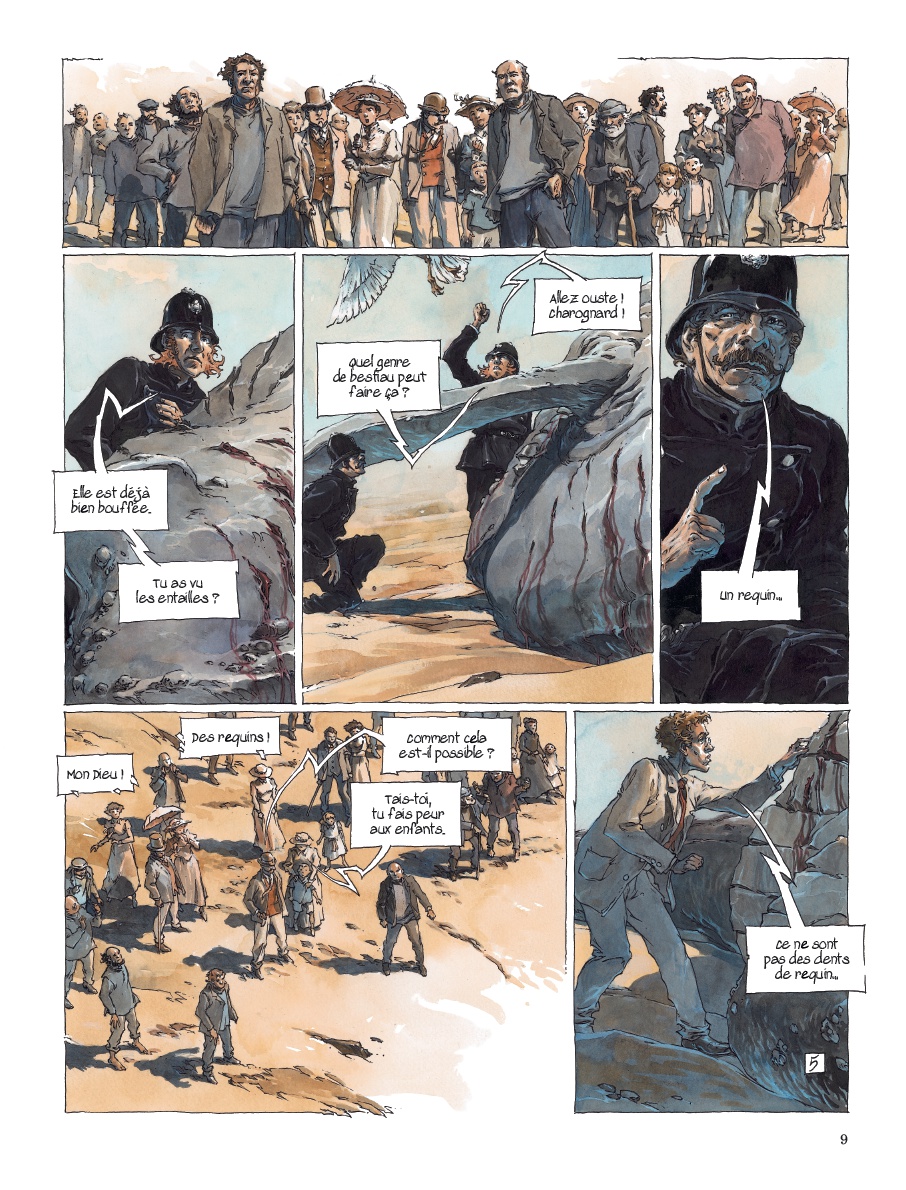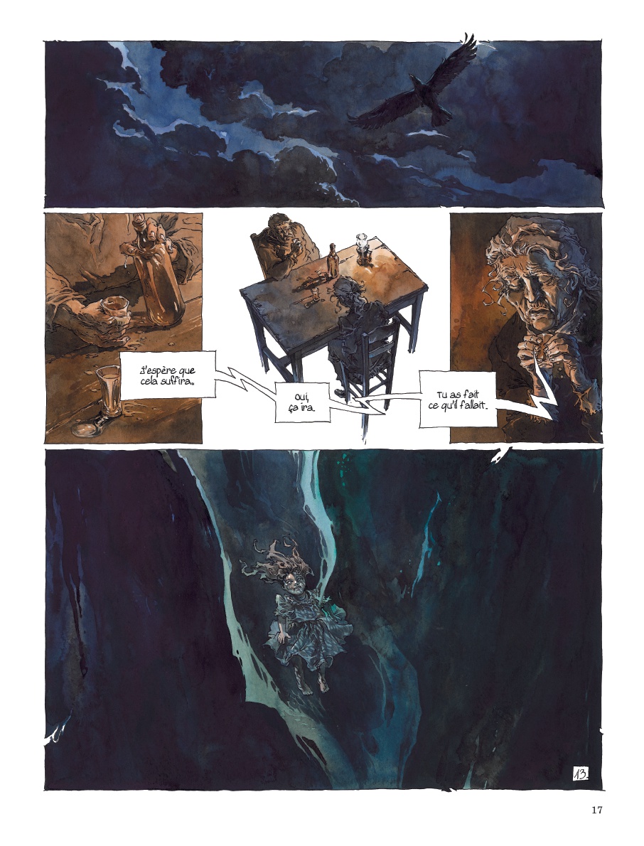Résumé: Le long de la côte galloise, un village est la proie d'une série de crimes inexplicables. Le personnage central – amateur de littérature fantastique – fait progressivement la connaissance d'une étrange jeune fille alternant douceur et furie. Le finale se déroule dans une demeure envoûtante pourtant supposée avoir été ravagée par le feu. La jeune fille se vengerait-elle des villageois qui ont refusé de porter secours à ses parents ? Une captivante réflexion sur les techniques que la BD offre pour transmettre le sentiment de « peur » et les mises en scène possibles de cette dernière. Sorel rend hommage à Arthur Machen, un de ses romanciers favoris ; toute la campagne, les forêts qui entourent ce petit village portuaire maudit s'inspirent des textes de cet auteur gallois. Un projet de plus de vingt ans prend ainsi forme en regroupant toutes sortes de références et de réflexions sur la mise en scène de la peur !