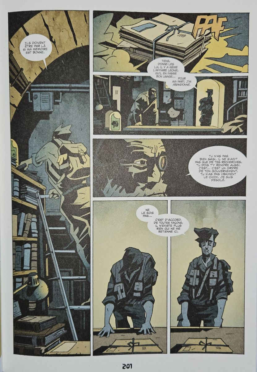 Longue et dramatique histoire que celle de Dessous! Première œuvre de l’auteur Bones prévue en trois tomes, la série a fait l’objet d’un de mes premiers billets sur le blog, il y a six ans, après une publication des deux premiers tomes en financement participatif chez feu Sandawe. C’est un peu le pire qu’il puisse se passer pour un auteur au commencement de sa carrière que de voir son éditeur disparaître, avec toute la ribambelle de problèmes de droits et de rachats qui l’accompagnent… Fort enjoué par cette proposition frenchie d’une lovecrafterie mignolienne matinée de Jules Verne, je rongeais mon frein de voir un jour sortir la conclusion lorsque l’on apprit que le décidément incontournable Komics initiative venait à la rescousse de ce dessinateur naufragé avec une ressortie de la série en format intégrale intégrant donc la conclusion inédite. Avec un apéritif sous la forme du confus Blood Moon réalisé entre temps, nous voilà en librairie pour ce qui mérite toute votre attention. Les deux premières parties ayant fait l’objet d’un billet (lien c-dessus) je m’attarderais sur la troisième partie. Dernière remarque : j’avais déjà noté un choix malheureux concernant le papier entre les deux premières parties, Komics et l’auteur n’ont malheureusement pas choisi de profiter de la réedition pour utiliser un papier glacé qui aurait mieux convenu au dessin aux superbes encrages et clarifié une ambiance que Bones semble avoir voulu vaporeuse. Laissons à César ce qui lui appartient… Attention spoilers (si vous n’avez pas lu les deux premières parties) Une des qualités de ce récit est sa construction et sa chronologie qui s’assument longues et radicales. Alors que la première partie se déroule dans les tranchées de la Grande Guerre, la seconde prend place un an après l’Armistice et la troisième en 1936. Le problème des récits lovecraftiens est souvent incapacité à dépasser le décorum monstrueux. Dans Dessous, Bones à l’inverse avance vite, par de larges ellipses, transposant son héros revenu d’entre les fous dans un entre-deux Guerres post-apocalyptiques après que le méchant de la seconde partie ait lâché les larves des créatures d’Outre-espace sur le monde. Nous découvrons ainsi Paris détruite et un reste de résistance parcourant les Cieux à bord d’immenses dirigeables armés. Mais les faibles humains ne résistent pas longtemps face aux « Kaijus » de l’époque et doivent se réfugier auprès de la dernière puissance qui semble pouvoir encore résister; l’Union Soviétique de Staline. Utilisant amoureusement le design militaire cyclopéen de l’armée soviétique, l’auteur joue avec ses personnages et cassant tout ce qu’il peut et en naviguant entre ses deux personnages que sont le héros et le très réussi allemand steampunk Baren laissé sur la Ligne Siegfried, dernière protection désespérée contre les monstres. L’ambiance n’est bien évidemment pas joyeuse et ressemble à une chute dans l’Abîme de l’humanité aux airs de voyage initiatique pour le héros à l’itinéraire très intéressant. Totalement effacé dans la seconde partie, il revient à bras le corps pour assumer un statut presque démiurge quand on réalise un lien unique entre son esprit et l’une des créatures. Réussissant joliment sa conclusion, Bones, respecte un cahier des charges conséquent et ses propres envies qui fort heureusement rejoignent celles des lecteurs. Excellent scénariste (bien plus que sur Blood Moon), l’auteur évite les chausses-trapes nombreuses de ce projet dont les seules crispations viennent de l’absence de traductions des dialogues en allemand et en russe, plutôt agaçants. Pour le reste on a une sorte de version lovecraftienne et fantasmée à la mode 1920 de la Guerre des Mondes d’une grande cohérence. Une belle prise de cet automne qui n’a pas à rougir face aux têtes de gondoles des grands éditeurs. Je vous invite vivement à tenter l’expérience… avant de voir la carrière de ce bel auteur décoller enfin. Lire sur le blog: https://etagereimaginaire.wordpress.com/2025/10/08/dessous/Le 12/10/2025 à 22:51:48