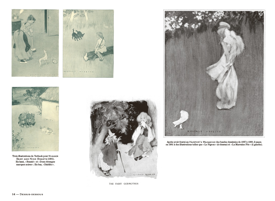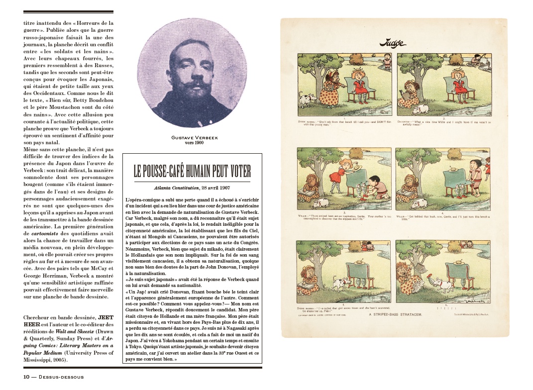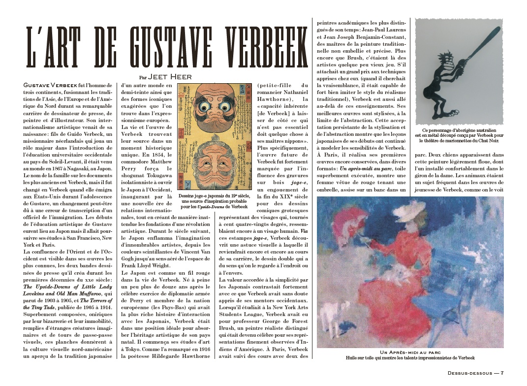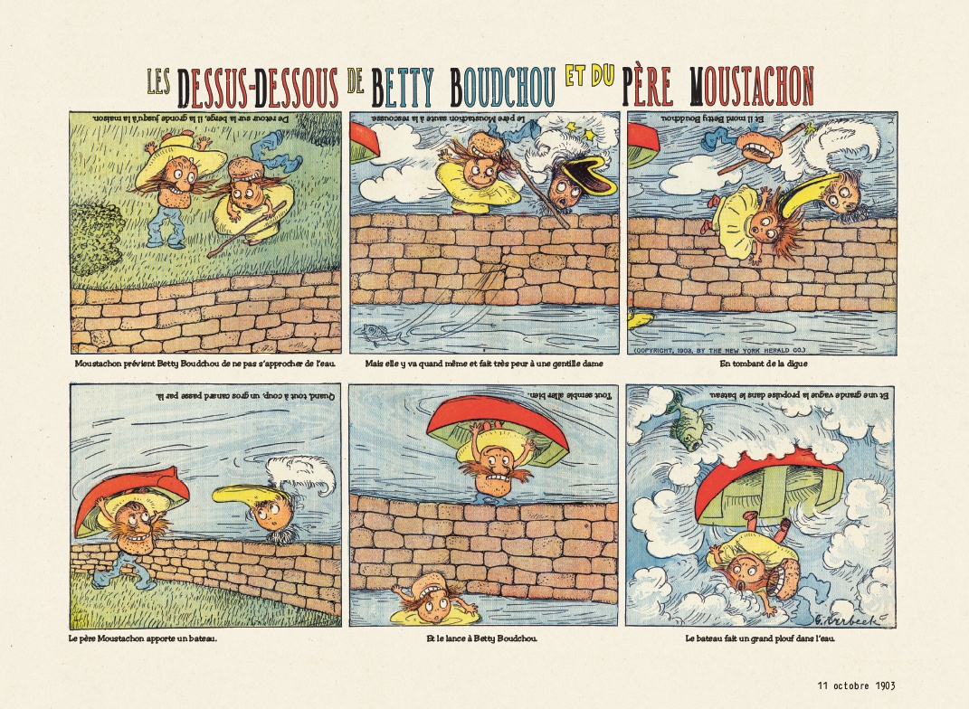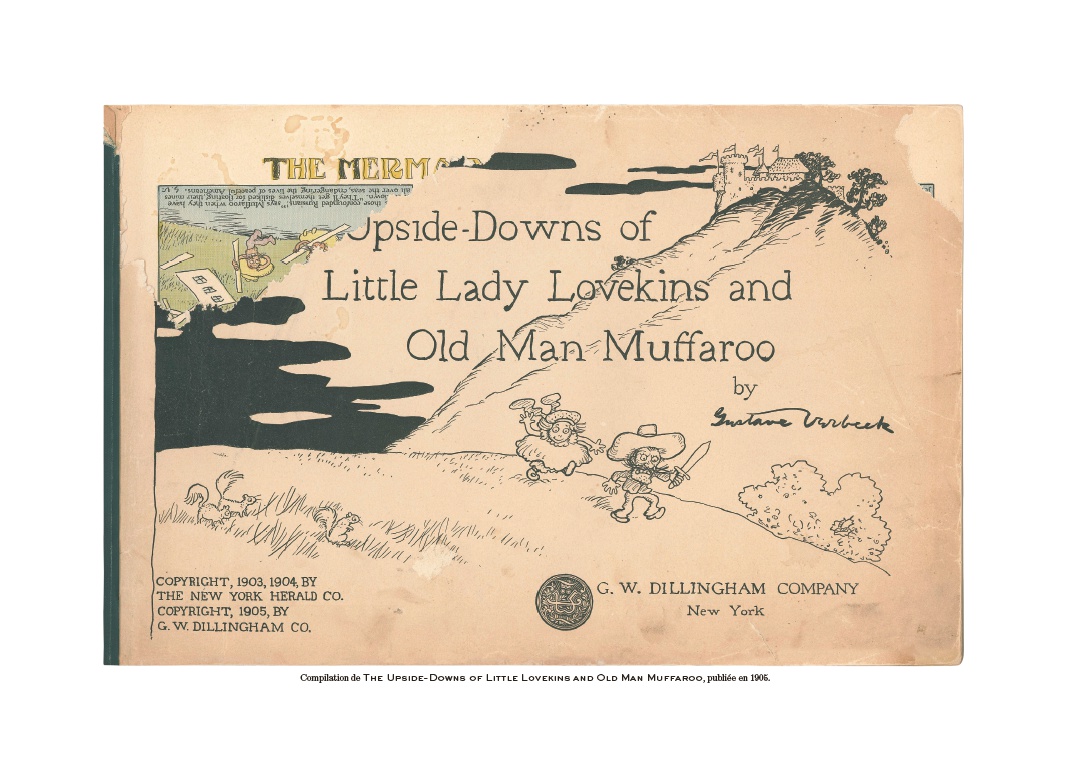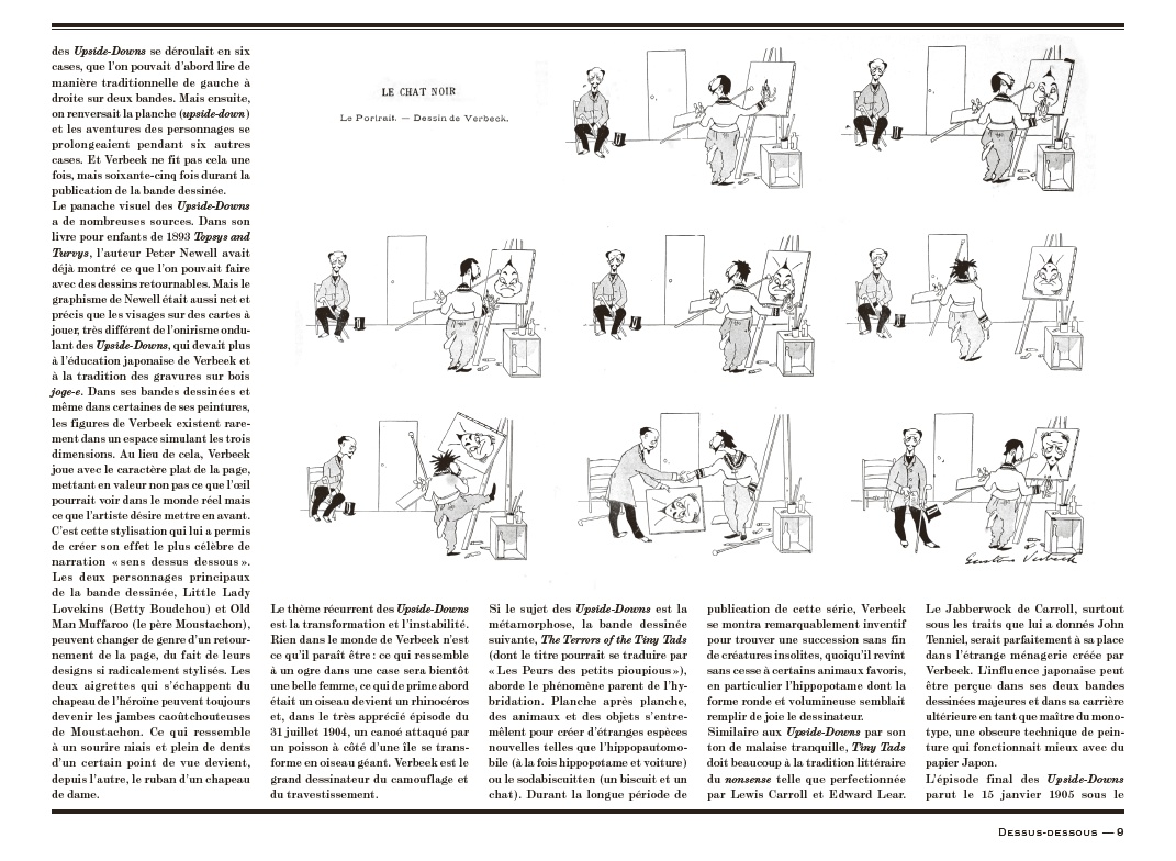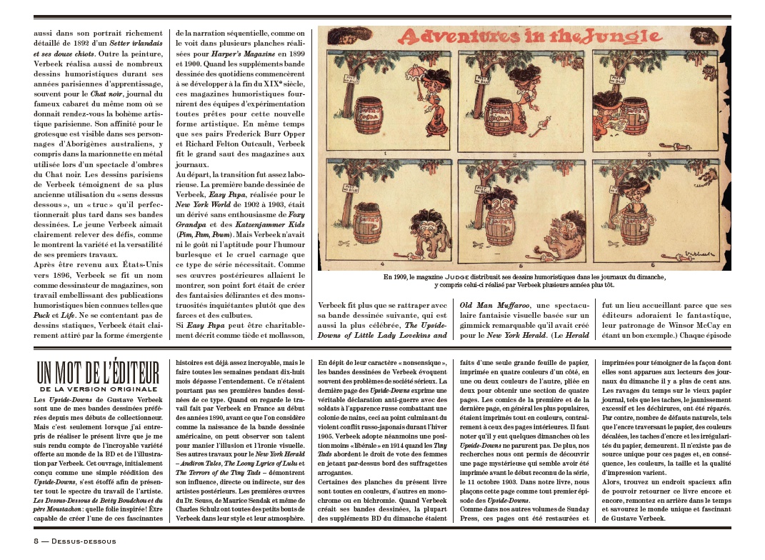 Ce chef-d’œuvre, anté-oubapien, date du tout début du XXe siècle et est contemporain des délires oniriques du Little Nemo de Winsor McCay. Il faudra toutefois attendre 1977 pour voir les strips de Gustave Verbeek traduits en français par l’éditeur Pierre Horay (avec réédition en 1978). Malheureusement, cette première version francophone n’était pas une intégrale des ‘Upside-Downs’ de Verbeek, mais surtout, elle était colorisée, et avec quelles couleurs criantes !! Ces couleurs masquant voire faisant disparaître plein de détails présents au départ. Nombre de bédéphiles ont crié au scandale, sachant que les strips originaux étaient majoritairement monochromes, seuls quelques-uns étant colorisés, avec des tons pastel. Merci donc à l’équipe des éditions Guy Delcourt de nous restituer ce chef d’œuvre dans son intégralité, et avec la colorisation d’origine. De plus, le format à l’italienne, avec des doubles strips de 3 cases, est plus facile à lire et comprendre que le format A4 avec 3x2 cases. Il faut aussi signaler la remarquable introduction par Martin Gardner qui, non seulement présente les autres œuvres de Gustave Verbeek, mais fait aussi un état des lieux du phénomène upside-down de l’époque. Un seul regret : pourquoi avoir voulu francisé le nom des 2 héros de la série (Little Lady Lovelinks & Old Man Muffaroo) en ‘Betty Boudchou’ et ‘Père Moustachon’. Un peu ridicule, sauf peut-être pour gagner un peu de place/caractères dans les légendes des cases. Sinon, chapeau pour ce travail qui remet à l’honneur un ouvrage franchement méconnu du grand public.BDGest 2014 - Tous droits réservés