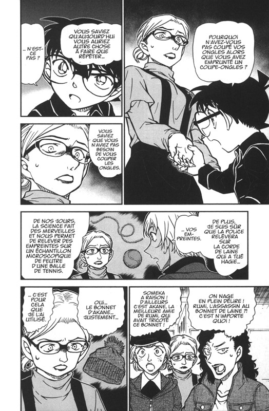 Résumé: Le meurtre de Mlle Hagie est sur le point d'être résolu ! La corde qui aurait servi à la tuer aurait été dissimulée dans son bonnet, en retricotant par dessus. Bien sûr, personne n'avait remarqué l'augmentation de la quantité de laine sur le bonnet. Maintenant que la police sait le comment, ils vont devoir trouver le coupable. Conan pourrait bien avoir sa petite idée...