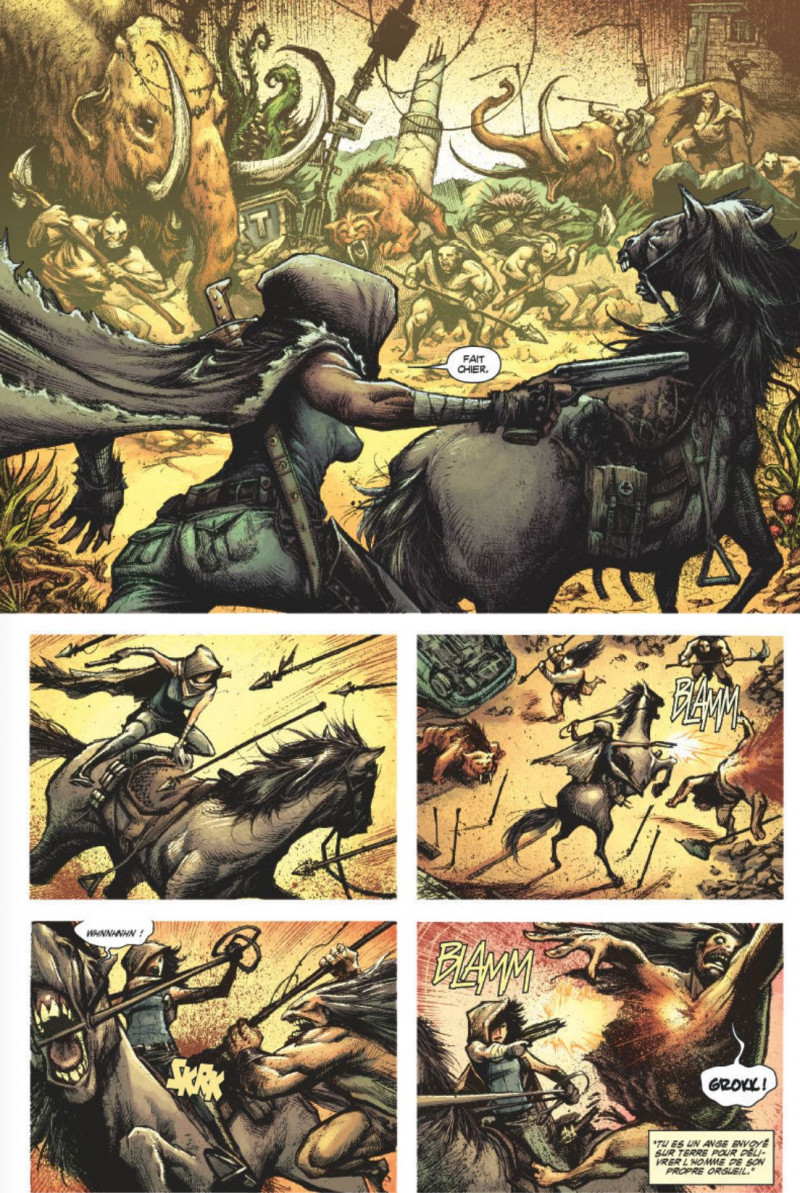 Moui… Alors, bon, oui, mais non. Plutôt non… D’accord, y’a plein de trucs sympas. Les dessins, types Comics, sont bourrés d’énergie, de nerf, de traits dynamiques assez réussis (même si j’ai un peu de mal avec les visages féminins). L’ambiance est excellente, entre post-apocalypse et… Euh… Ben post-apocalypse, mais j’ai plusieurs films qui me viennent, du zombi à Mad Max… Bref, l’ambiance fonctionne. Le retour au « préhistorique » avec un virus devant supprimer la croyance en Dieu, bon, déjà, là, je marche plus trop… C’est assez tiré par les cheveux et très « prétexte », genre, « eh, on dirait que des gens feraient un vaccin qui feraient que les gens redeviendraient préhistoriques avec des bêtes qui auraient plein de dents ». Pourquoi ? Ben pourquoi pas… Bon. Mais du coup, le final est aussi pauvre que le début… Toute la partie centrale, qui n’est qu’une sorte de fuite en avant, une poursuite gentil/méchant, fonctionne plutôt bien. Mais elle est entourée, au début et la fin, de raison ultra tordues pour justifier le tout, sans véritable fin, e qui donne à l’ensemble un côté plus que bancal, une sorte de truc où les types avaient envie de s’éclater avec le milieu sans trop chercher de bonnes explications pour y arriver… Passable.Le 14/10/2018 à 19:19:50