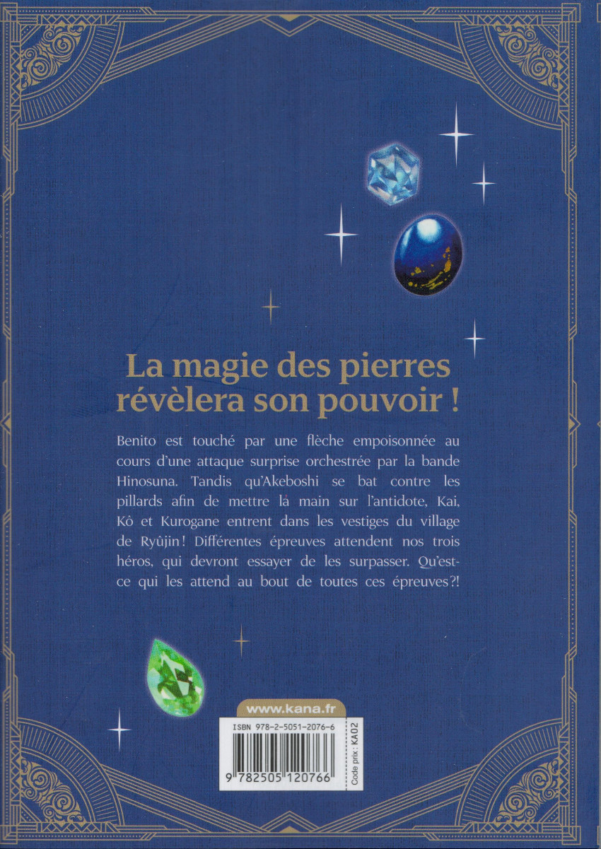 Résumé: Benito est touché par une flèche empoisonnée au cours d'une attaque surprise orchestrée par la bande Hinosuna. Tandis qu'Akeboshi se bat contre les pillards afin de mettre la main sur l'antidote, Kai, Kô et Kurogane entrent dans les vestiges du village de Ryûjin ! Différentes épreuves attendent nos trois héros, qui devront essayer de les surpasser. Qu'est-ce qui les attend au bout de toutes ces épreuves ?!