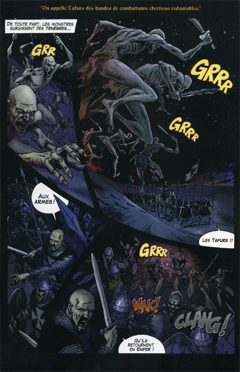 Résumé: Les Hospitaliers ont dû abandonner le Krak aux Sarrasins et bénéficient d'un sauf-conduit jusqu'en Occident. Mais le chemin du retour s'avère périlleux puisqu'ils sont attaqués dès leur première nuit dans le désert par un groupe de guerriers sauvages et terrifiants : les Tafurs. Argan, seul survivant, est enlevé. Un détachement templier mené par un certain Audoin de Craon se rend sur les lieux du massacre afin de retrouver d'éventuels survivants... Qui sont les Tafurs et où ont-ils emmené le moine chevalier ? Quel sort réservent-ils à Argan ? Jusqu'où iront les Templiers ?