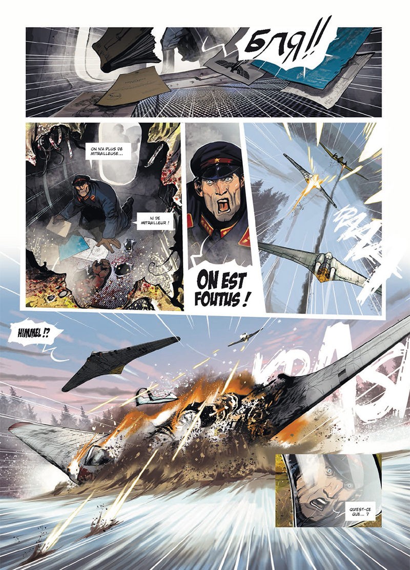 Ronan Toulhoat semblait vouloir prendre de la distance avec l’uchronie et la Seconde Guerre mondiale. Manifestement, il a craqué et semble en être très heureux. En effet, il s’en donne à cœur joie, profitant des nombreuses séquences de combat pour faire jouer toute sa science du mouvement. Ceux qui l’ont connu avec Block 109 n’en seront pas surpris. Par contre, s’ils ne l’ont pas suivi sur le très bon Chaos Team, ils seront étonnés des progrès réalisés dans l’identification des personnages, la gestion des couleurs et le réalisme des décors. Il sera toujours possible d’ergoter sur certaines peccadilles (visages pas toujours constants, quelques expressions approximatives), mais l’ensemble laisse surtout transparaître une grande capacité à mettre en place les ambiances.
