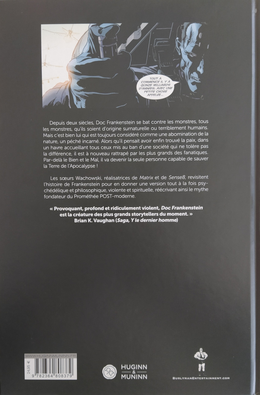 Info édition : Publié pour la première fois en 2019 par Bulyman Entertainment Inc. sous le titre original "Doc Frankenstein: The post-modern Prometheus". Les pages 10 à 170 ont été publiées sous forme de 6 magazines. Les pages 171 à 234 sont reproduites pour la première fois. En fin d'album, une galerie d'illustrations (5 pages).