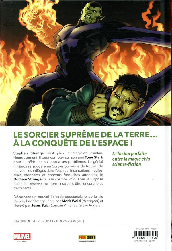 Résumé: Le Docteur Strange ne contrôle plus la magie. Le Sorcier Suprême emprunte alors un vaisseau à Tony Stark, et décide de parcourir le cosmos afin de rencontrer d’autres sorciers, de comprendre et de s’inspirer de leurs pratiques. Dans sa quête, il va découvrir une Pierre de l'Infini… Mark Waid (Daredevil) et Jesus Saiz (Captain America) donnent une nouvelle direction au Sorcier Suprême.