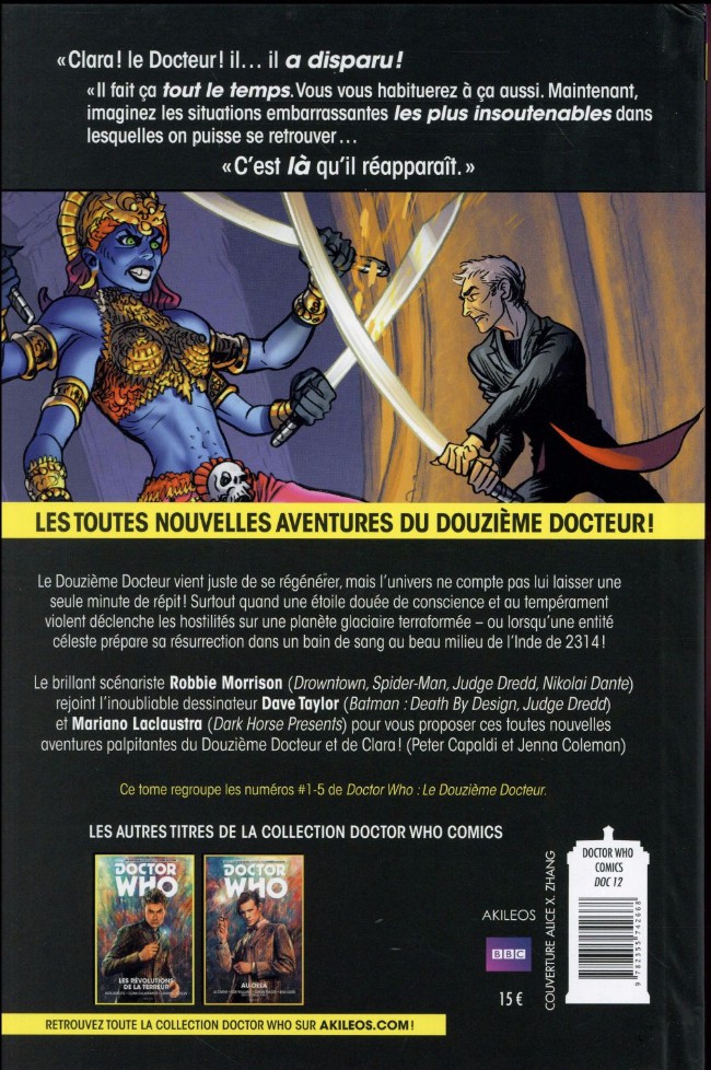 Résumé: Le Douzième Docteur vient juste de se régénérer, mais l'univers ne compte pas lui laisser une seule minute de répit ! Surtout quand une étoile douée de conscience et au tempérament violent déclenche les hostilités sur une planète glaciaire terraformée - ou lorsqu'une entité céleste prépare sa résurrection dans un bain de sang au beau milieu de l'Inde de 2314 ! Le brillant scénariste Robbie Morrison (Drowntown, Spider-Man, Judge Dredd, Nikoloi Donte) rejoint l'inoubliable dessinateur DaveTaylor (Batmon ; Death By Design, Judge Dredd) et Mariono Lacloustra (Dork Horse Presents) pour vous proposer ces toutes nouvelles aventures palpitantes du Douzième Docteur et de Clora ! (Peter Copoldi et Jenna Coleman)