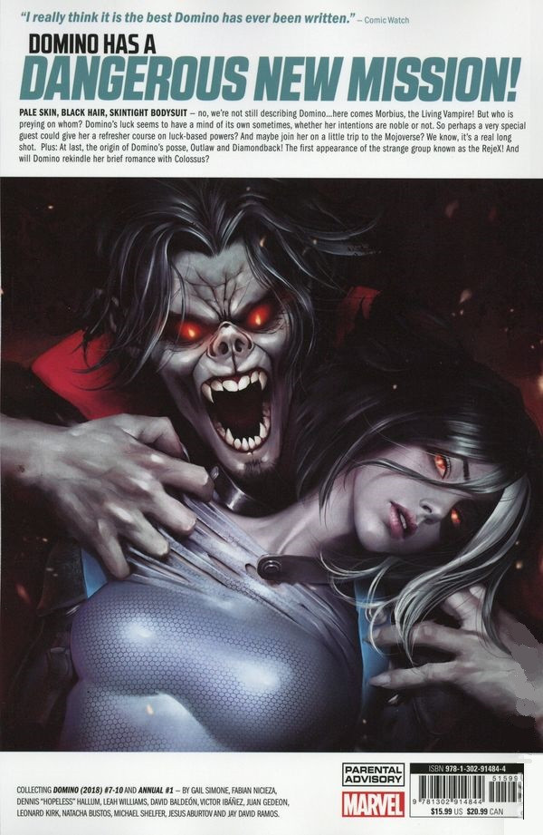 Résumé: Domino has a dangerous new mission! Pale skin, black hair, skintight bodysuit - no, we're not still describing Domino...here comes Morbius, the Living Vampire! But who is preying on whom?