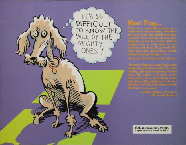 Résumé: Frank Stack produced some amazing underground comics in the '60s and '70s. This was not one of them, but the 50 pages of mostly one-pagers about a very neurotic dog named Ping and his fairly callous owner offers some amusing moments, especially for anyone who has ever loved a nervous dog. I get the sense that this was a labor of love for Stack.
