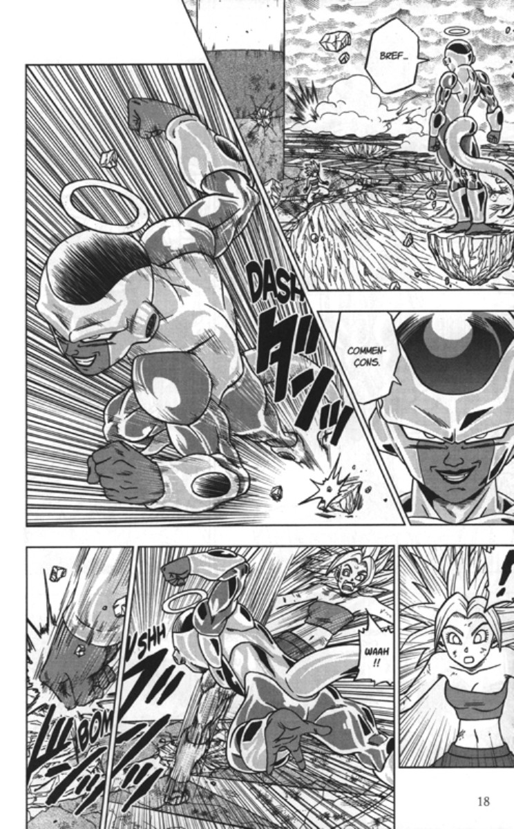 Le Tournoi Multi-Univers se poursuit et commence à faire de plus en plus de ravages, de nombreux univers passant à la trappe les uns après les autres. Le tournoi avançant, San Goku et ses amis encore en lice se retrouvent confrontés désormais uniquement à des adversaires redoutables. Bon, bin … le Tournoi se poursuit et c'est à peu près tout. Voilà voilà. Si l'on arrive à faire abstraction de la pauvreté du scénario, on saura apprécier ce volume qui réserve quand même quelques jolies surprises: la séquence avec Kale notamment (la super Sayen démoniaque) est bien vue et fait presque flipper. Autre point appréciable, ce volume met en valeur les personnages secondaires qui composent l'équipe de San Goku. Ainsi, San Gohan, C-17 ou Tortue Géniale ont chacun leur moment de gloire un court instant, et c'est plutôt sympa. La fin de cet épisode laisse augurer un prochain album qui sera centré sur la lutte contre Jiren, le combattant ultime. Espérons que cet affrontement tiendra ses promesses et viendra rehausser un cycle pour l'instant plutôt répétitif.BDGest 2014 - Tous droits réservés