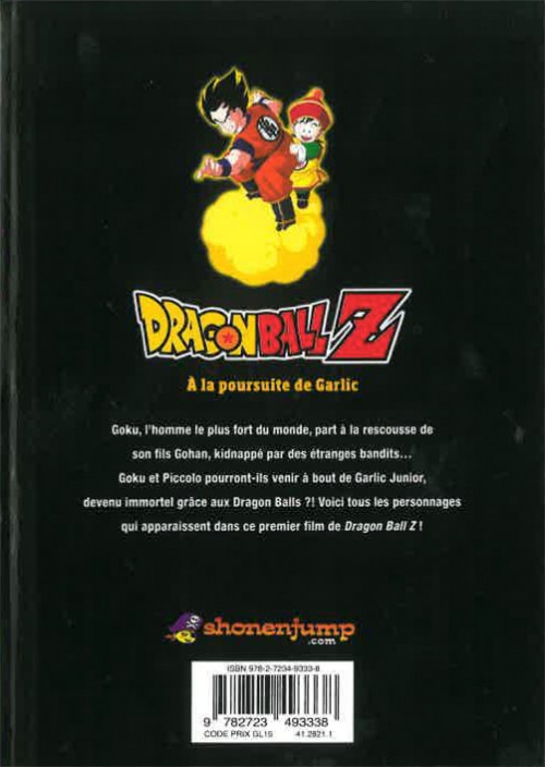 Résumé: Pour la première fois en France, toutes les aventures inédites de DBZ en manga ! Vous croyez avoir lu tout Dragon Ball Z ? Découvrez 15 nouvelles aventures des Super Guerriers, inédites en manga, des méchants toujours plus puissants et des combats toujours plus impressionnants !Garlic Junior est un démon exceptionnel, à linstar du Tout Puissant. Jaloux de son aîné, il décide de réunir les 7 boules de cristal afin dacquérir limmortalité. Mais lune de ces boules orne le chapeau du fils de Son Goku, précipitant le rapt de ce dernier par les mercenaires de Garlic. Piccolo et Son Goku se lancent alors à lassaut du palais, alors que Garlic appelle le dragon Shenron.Lhistoire de ce 1er film se situe entre Dragon Ball et Dragon Ball Z, peu avant larrivée des Super Guerriers (Raditz et Vegeta) sur Terre. Elle révèle pour la première fois toute létendue des pouvoirs de Son Gohan.Les éditions Glénat sont fières de pouvoir mettre enfin à disposition des lecteurs français les anime comics tirés des films de Dragon Ball Z et Dragon Ball. Chaque ouvrage reprend lentièreté de la trame dun film et fonctionne ainsi en one-shot. 1 film = 1 histoire complète = 1 manga ! À partir de février 2013, retrouvez tous les deux mois un nouveau one-shot, présentant des méchants inédits et de nouveaux combats dantesques !