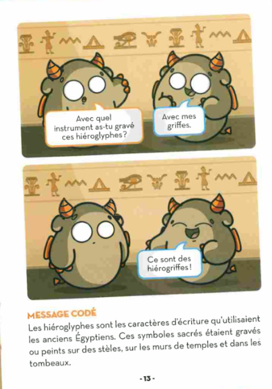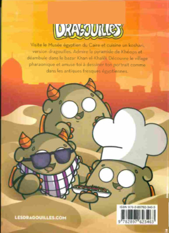 Résumé: Les Dragouilles sont de drôles de petites créatures s'apparentant à des "Monsieur Patate" cornus, affublés d'une queue et d'ailes de démons. Chaque titre de la série regroupe de courtes bandes dessinées mettant en scène ces êtres fabuleux auxquelles se greffent des charades, des jeux, des recettes, des idées de bricolage, des blagues, des devinettes et des rubriques informatives sur des sujets variés, qui permettent ici de glaner quelques menus faits à propos du Caire en mettant de l'avant de menus faits concernant son histoire, ses spécialités culinaires, sa surpopulation, ses tempêtes de sable, le plateau de Gizeh, le Nil, les pyramides et le Sphinx, l'importance que les anciens Égyptiens accordaient à la mode, les technologies innovantes utilisées afin de sonder l'intérieur de la pyramide de Khéops, etc.