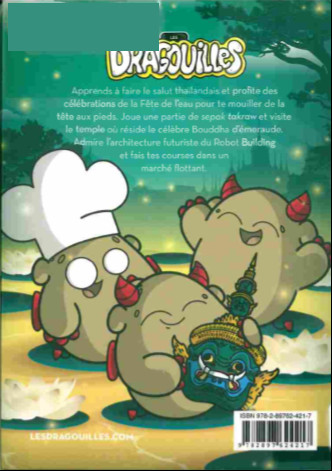 Résumé: Les Dragouilles sont de drôles de petites créatures s'apparentant à des "Monsieur Patate" cornus, affublés d'une queue et d'ailes de démons. Chaque titre de la série regroupe de courtes bandes dessinées mettant en scène ces êtres fabuleux auxquelles se greffent des charades, des jeux, des recettes, des idées de bricolage, des blagues, des devinettes et des rubriques informatives sur des sujets variés, qui permettent ici de glaner quelques menus faits à propos de Bangkok, capitale entre tradition et modernité, en mettant de l'avant de menus faits concernant son histoire, ses spécialités culinaires, les marques de politesse de ses habitants, ses cérémonies et fêtes incontournables, ses spectacles de marionnettes, ses centres commerciaux et marchés impressionnants, ses gratte-ciel les plus originaux, ses temples, ses sanctuaires pour éléphants...