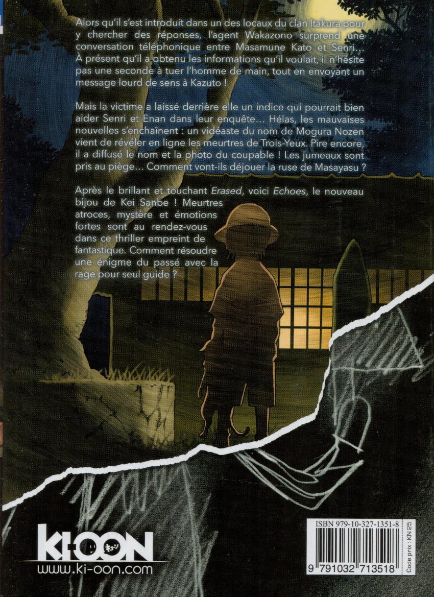 Résumé: Quand la douleur du passé est le seul chemin vers la vengeance...Alors qu'il s'est introduit dans un des locaux du clan Itakura pour y chercher des réponses, l'agent Wakazono surprend une conversation téléphonique entre Masamune Kato et Senri... À présent qu'il a obtenu les informations qu'il voulait, il n'hésite pas une seconde à tuer l'homme de main, tout en envoyant un message lourd de sens à Kazuto ! Mais la victime a laissé derrière elle un indice qui pourrait bien aider Senri et Enan dans leur enquête... Hélas, les mauvaises nouvelles s'enchaînent : un vidéaste du nom de Mogura Nozen vient de révéler en ligne les meurtres de Trois-Yeux. Pire encore, il a diffusé le nom et la photo du coupable ! Les jumeaux sont pris au piège... Comment vont-ils déjouer la ruse de Masayasu ?