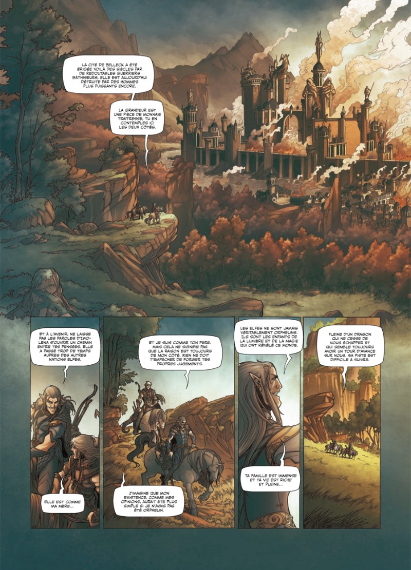 Sur les hauteurs de la cité de Belleck. Deux Elfes blancs contemplent la destruction de la splendide ville érigée voilà des siècles par des humains guerriers-bâtisseurs. D’autres hommes la ravagent, la pillent, la brûlent et la réduisent en cendres… Spectacle consternant pour les sages Elfes blancs qui ne peuvent comprendre ce besoin d’anéantissement qui anime ces viles créatures que sont les hommes… Ces deux Elfes sont des pisteurs sur les traces d’un rarissime et puissant dragon blanc qu’ils veulent amener dans leurs îles. Soudain, ils tombent sur un homme et une femme qui ont réussi à fuir la ville. Ils n’iront pas loin ! La femme est enceinte et cinq guerriers sont sur leurs traces. La sagesse elfique leur recommande de ne pas s’occuper des affaires des hommes… Critique : Le rythme de cette histoire est particulièrement lent puisqu’il s’agit d’une traque d’un rarissime dragon blanc. Cette quête prend des années et est saupoudrée d’aventures secondaires qui vont lier un Elfe blanc à un homme. Mais Fall, l’Elfe, est-il aussi blanc que ce que son père adoptif voudrait le lui faire croire ? Va-t-il respecter les lois ancestrales des Elfes blancs ? Le principal mérite de cet album réside dans la présentation d’une nouvelle race elfique, la plus ancienne, la plus sage, celle des Elfes blancs. Je n’ai pas palpité pour cet album autant que pour les précédents. Le rythme y est pour beaucoup. Les visages des personnages à mi-chemin entre dessins comiques et dessins réalistes ne m’a pas convaincu. Livre intéressant à lire pour ne rien perdre de l’ensemble de la saga, mais sans plus.Le 07/08/2022 à 16:08:46
