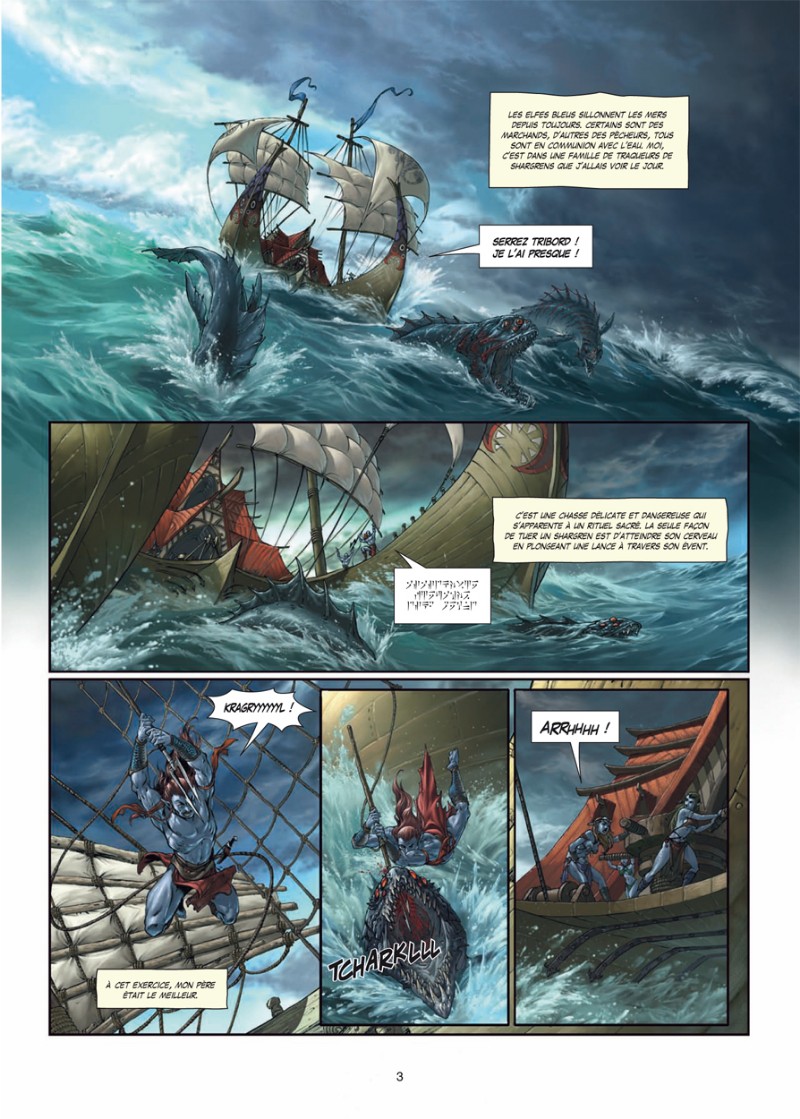 Savez-vous qu’on ne naît pas vraiment Elfe noir ? Non ! Il n’y a pas de tribus d’Elfes noirs comme il y en a d’Elfes bleus, de Sylvains ou d’Elfes blancs ! Chez tous les Elfes peut naître un enfant qui deviendra un Elfe noir car tous les Elfes portent en eux le gène de l’Elfe noir. Gaw’er est né sur un bateau de pêche. Ses parents sont des Elfes bleus. Le petit se montre très curieux et casse-cou. Il est aussi sujet à des crises de rage incontrôlables au grand désarroi de son père. Port-Vogue est le lieu où les Elfes du Sud se retrouvent pour échanger ce qu’ils ont à vendre contre ce dont ils ont besoin. Gaw’er adore le lieu… Critique : Le scénario très original d’Arleston est vraiment intéressant car il permet de découvrir comment sont recrutés ceux qui vont devenir des Elfes noirs… ou pas ! Nombreux sont les appelés, rares sont les élus… Et les autres me demanderez-vous ? Guère plus que des déchets… Bon, vous l’avez compris, désolé si vous adorez les Elfes, mais il va falloir réviser votre jugement une fois que vous aurez découvert la nature des Elfes noirs. Cet album va vous permettre de découvrir le long, et périlleux, apprentissage d’une de ces créatures, une créature qui n’aura jamais d’amis. Les dessins de Ma Yi sont très réussis, mais la lisibilité des planches n’est pas évidente car pour des raisons thématiques, les couleurs sont très sombres et la visibilité réduite.Le 07/08/2022 à 16:16:50