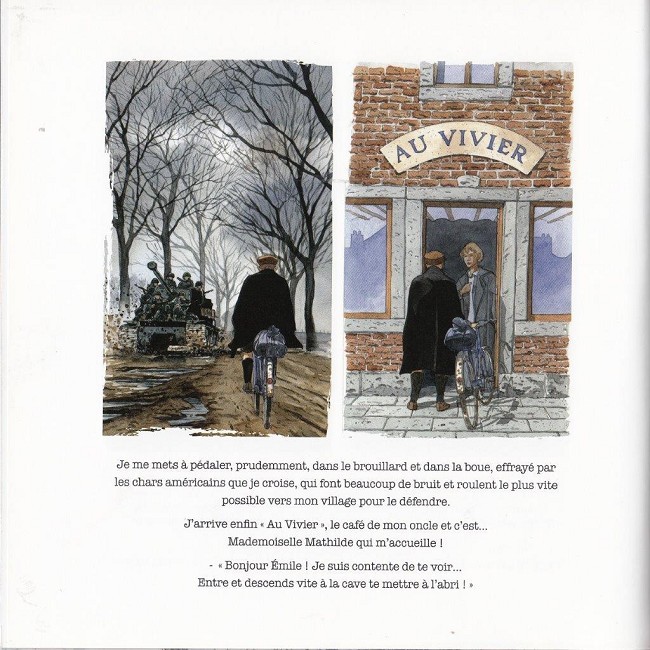Résumé: Livre illustré créé pour le Bastogne War Museum. Émile Mostade est un jeune garçon belge qui vit à Noville sur la route au nord de Bastogne. Il a 13 ans en septembre 44. Émile est fils unique. Son père et sa mère tiennent un petit commerce de cycles dans Bastogne. Émile n'a presque plus le souvenir de comment c'était avant les Allemands. Alors quand ils sont partis en septembre 44, Émile a fait la fête, comme tout le monde. D'un seul coup, tout était permis, même monter sur les Jeep des Américains en mâchant de la gomme. Son père lui promet qu'au printemps prochains, ils iront ensemble à vélo traverser toute la Belgique jusqu'à Zeebrugge pour voir la mer avec les drapeaux belge et américain accrochés sur le guidon. Trois mois plus tard, un important détachement américain prend position tout autour du village. Un des soldats s'approche d'Émile et crie avec un fort accent : "Vite, allez vous cacher ! Les Allemands reviennent !"