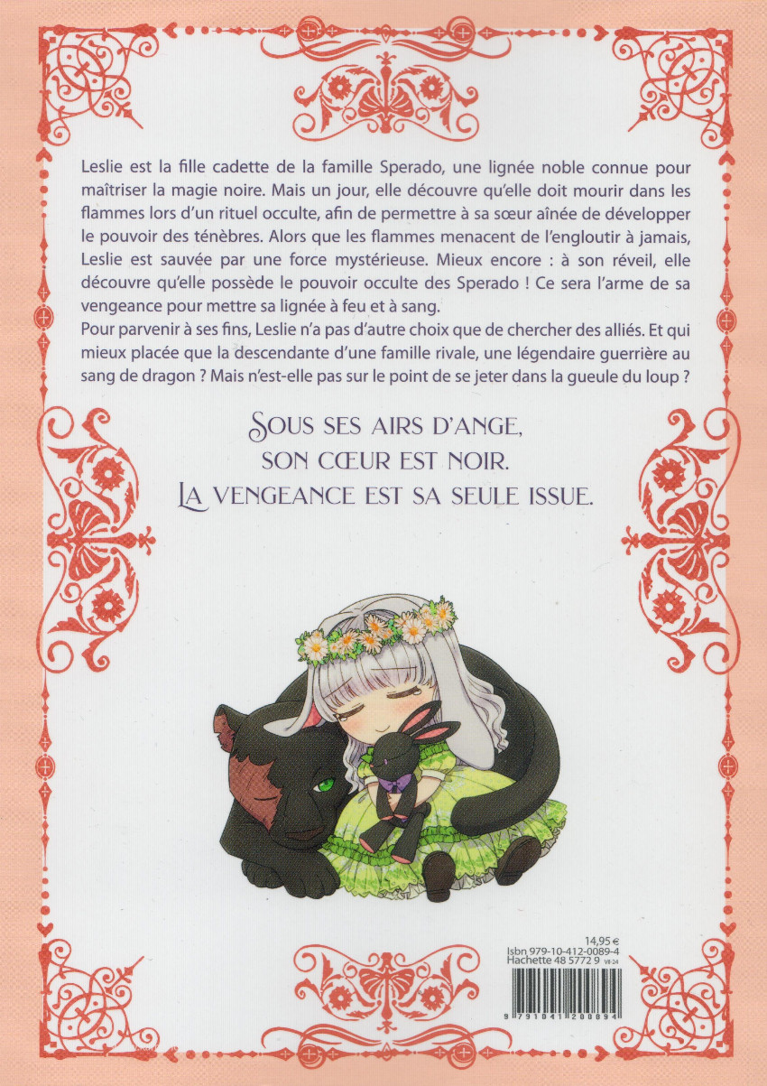 Résumé: Leslie est la fille cadette de la famille Spérado, une lignée noble connue pour maîtriser la magie noire. Mais loin du destin qui sied à son rang de marquise, elle a été élevée dans l'ombre de sa soeur. Et un jour, elle découvre même qu'elle doit mourir dans les flammes lors d'un rituel occulte, afin de permettre à sa soeur aînée de développer le pouvoir des ténèbres. Mais alors que les flammes menacent de l'engloutir à jamais, Leslie est sauvée par une force mystérieuse : celle de tous les enfants de la famille sacrifiés avant elle. A son réveil, elle découvre qu'ils lui ont confié le pouvoir occulte des Spérado ! Celui-ci sera l'arme de sa vengeance. Car désormais, le but de Leslie est clair : mettre sa lignée à feu et à sang. Mais, même avec la magie noire, pas facile de détruire une famille ancestrale... Pour parvenir à ses fins, Leslie n'a pas d'autres choix que de chercher des alliés. Quitte à s'allier avec une guerrière d'une famille ennemie au sang de dragon...