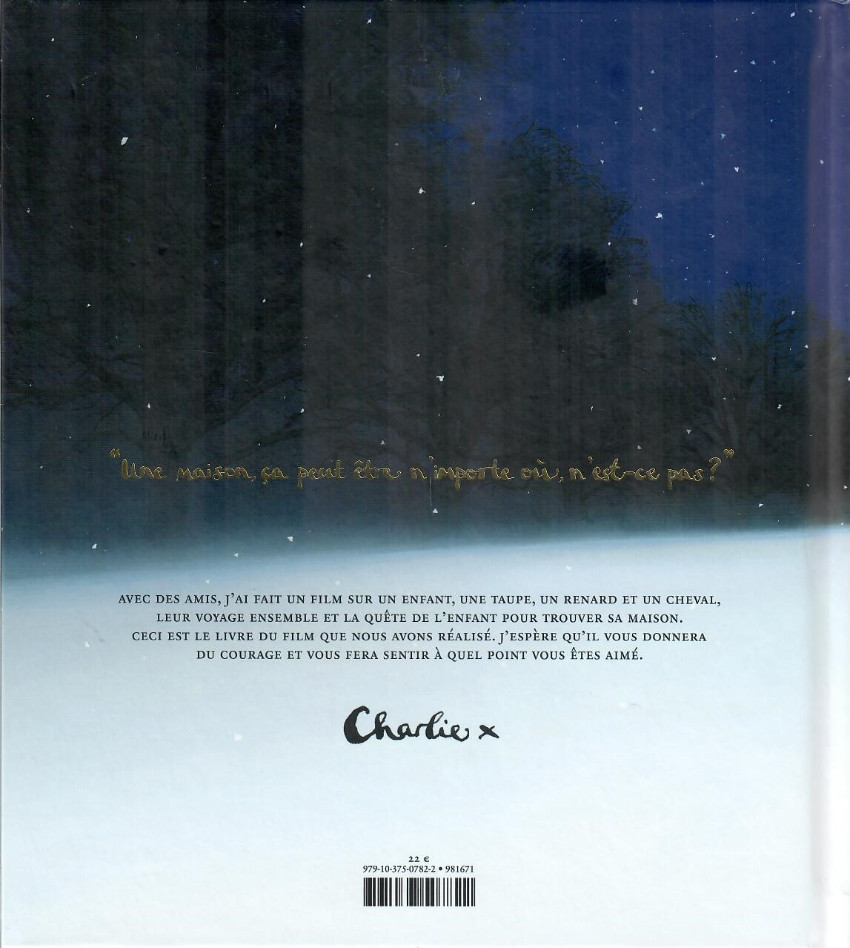 Résumé: "une maison, ça peut être n'importe où, n'est-ce pas ?".Avec des amis, j'ai fait un film sur un enfant, une taupe, un renard et un cheval, leur voyage ensemble et la quête de l'enfant pour trouver sa maison. Ceci est le livre du film que nous avons réalisé. j'espère qu'il vous donnera du courage et vous fera sentir à quel point vous êtes aimé.