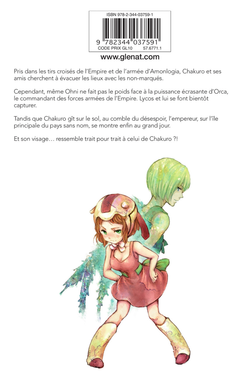 Résumé: Pris dans les tirs croisés de l'Empire et de l'armée d'Amonlogia, Chakuro et ses amis cherchent à évacuer les lieux avec les non-marqués. Cependant, même Ohni ne fait pas le poids face à la puissance écrasante d'Orca, le commandant des forces armées de l'Empire. Lycos et lui se font bientôt capturer. Tandis que Chakuro gît sur le sol, au comble du désespoir, l'empereur, sur l'île principale du pays sans nom, se montre enfin au grand jour. Et son visage... ressemble trait pour trait à celui de Chakuro ? !
