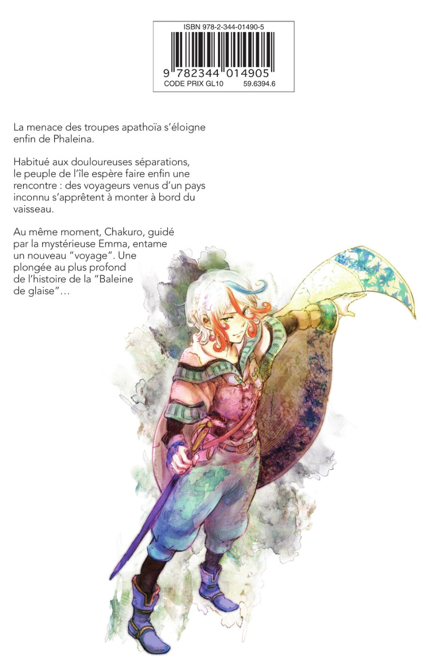Résumé: La menace des troupes apathoïa s’éloigne enfin de Phaleina. Habitué aux douloureuses séparations, le peuple de l’île espère faire enfin une rencontre : des voyageurs venus d’un pays inconnu s’apprêtent à monter à bord du vaisseau. Au même moment, Chakuro, guidé par la mystérieuse Emma, entame un nouveau “voyage” : une plongée au plus profond de l'histoire de la “Baleine de glaise”…
