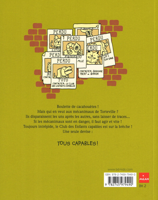 Résumé: Misère et bille de terre ! Au 221 de la rue Mitron, le jeune et génial inventeur Ben Pinson est très embêté : son aimant à charbonbon a disparu. Ben alerte sa sœur Capucine. Mais celle-ci est bien trop occupée à essayer son nouveau béret en feutrine de Chine. Il faut dire, que le soir même, le comte Grifoli, nouvellement installé à Torteville, donne un bal masqué. Et Capucine veut, bien sûr, être la plus belle pour aller danser. Mais alors qu’elle se prépare, Litchi, le mécani-chaton royal de la princesse Alice disparaît subitement. Puis c’est au tour de Frou-Frou, le mécani-autruche de Mademoiselle Julie, de se faire la malle. Quand Toto disparaît lui aussi, le sang de détective de Capucine se réveille ! Il faut sauver les mécanimaux ! Le Club des Enfants capables se lance aussitôt à l’assaut des indices. Leur enquête va les conduire à élaborer un stratagème décoiffant pour démasquer et arrêter le pire méchant de l’Univers. A savoir : le chat évidemment ! Une série pétillante pour plonger dans un univers foisonnant et délicieusement steampunk !