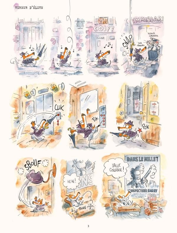 Le style touffu et sympathique de Vincent Odin attire immédiatement l’œil. En effet, la mise en page ouverte et les aquarelles colorées rappelleront certainement des souvenirs aux amateurs de Benjamin Renner et de son Grand Méchant Renart. Malheureusement, la comparaison s’arrête là. Le trait souvent confus et l’absence de tout second degré rend la lecture quasiment rébarbative, car rarement drôle.