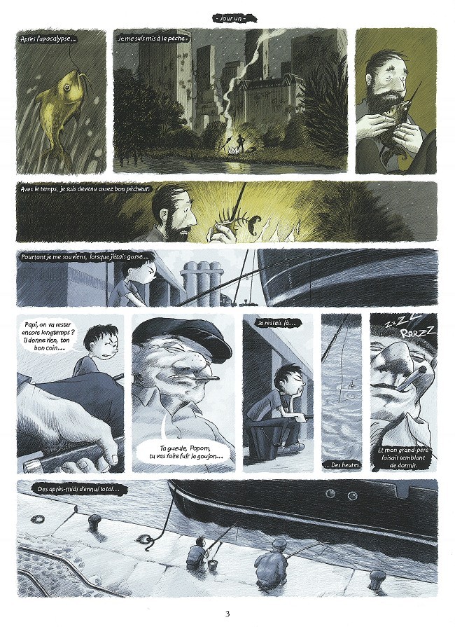 J'ai beaucoup aimé le dessin tout en crayonné ainsi que cette magnifique couverture sur une grande mégalopole de style New-York après un cataclysme de fin de monde. Il ne reste plus qu'un seul être humain et on va assister progressivement à sa déchéance. Il est dommage que l'on soit tourné seulement autour de lui sans savoir véritablement ce qui s'est passé pour en arriver là. Il y aura le souvenir de son grand-père amateur de pêche puis d'une belle chanteuse qu'il a connue dans un cabaret de jazz. Tout ceci amène vers des réflexions philosophiques du moi intérieur. C'est un peu trop nombriliste pour moi dans son approche. Dommage car il y avait matière à en raconter plus surtout si l'auteur nous souligne de si beaux décors et de détails. On sent toute la solitude du monde et combien l'homme a besoin d'autrui pour survivre même s'il a tout ce dont il pouvait rêver. Bref, une femme, c'est l'être le plus important dans l'univers ! Il ne reste que les souvenirs dans ce monde de fantôme qui devient étouffant et ennuyeux.Le 24/10/2010 à 12:50:43