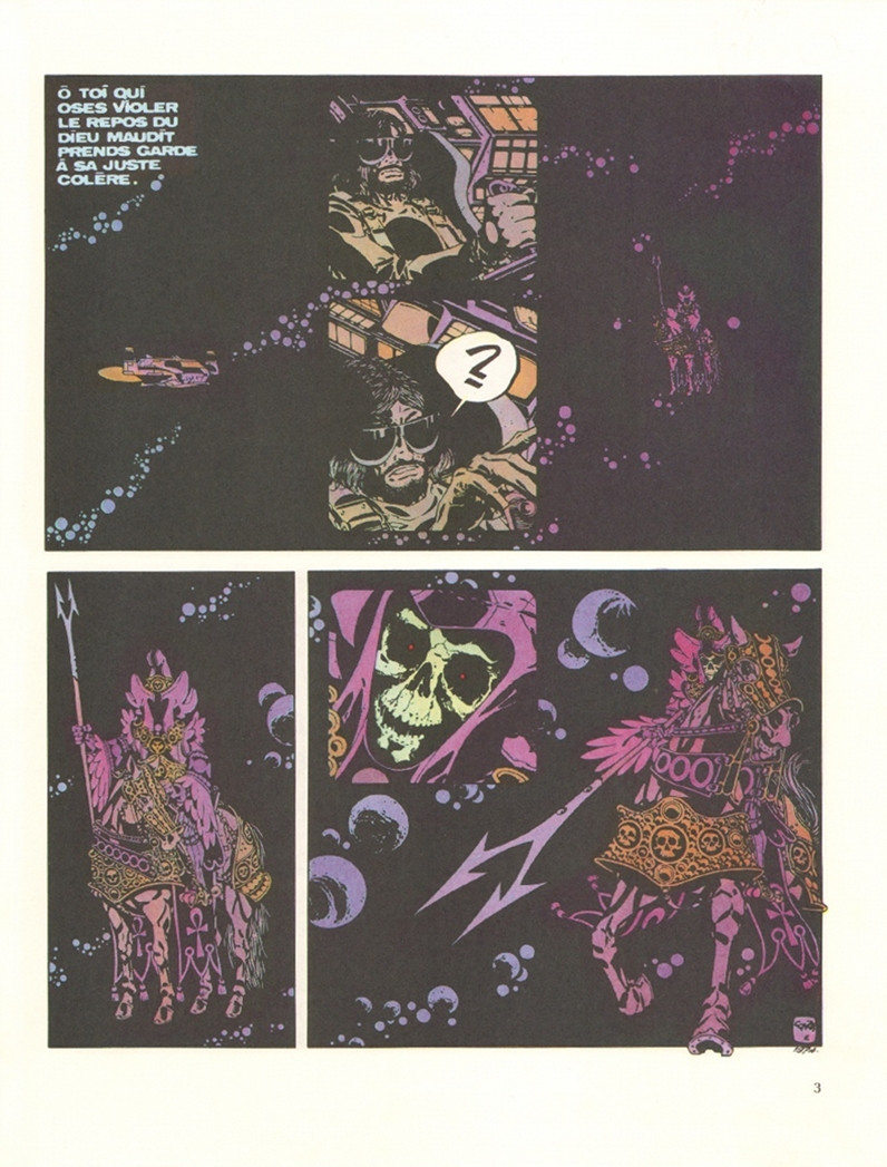 Résumé: La nef d'Ergün explose dans l'espace. Ce qui fut lui quitte son corps physique, devenu une enveloppe vide à jamais prisonnière du vaisseau déchiqueté. Son double flottant va alors rencontrer le cavalier de la mort, le "pape du néant", le gardien des âmes. Il va traverser le fleuve des morts qui mène au royaume des ténèbres. Une cathédrale volante... un combat d'avions de la première guerre mondiale... l'armée de squelettes qui plane au-dessus des champs de bataille... Adof Hitler... le chevalier noir encore…