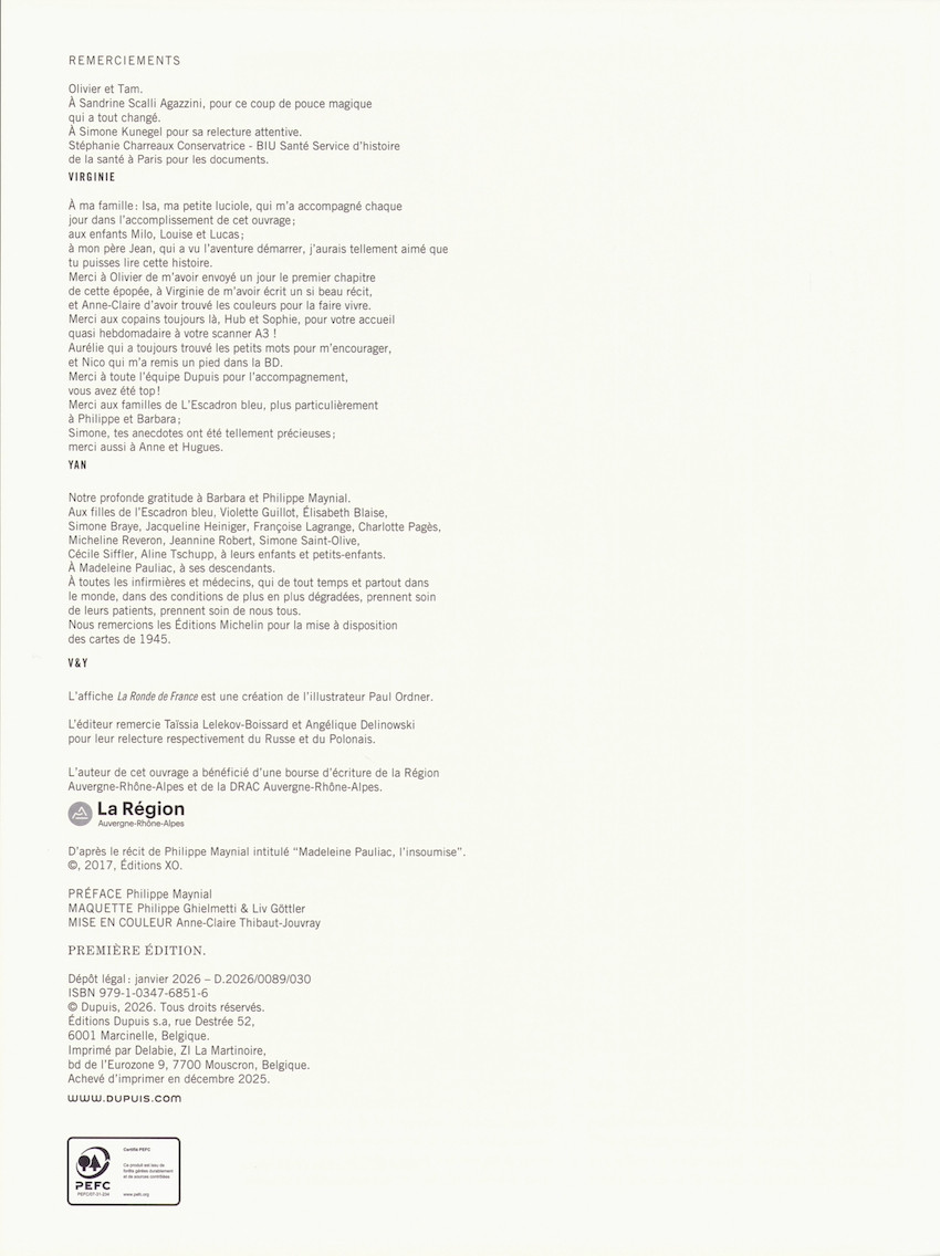 Après les aventures de Madeleine Riffaud - grande résistante et engagée politique, femme de lettres et aventurière -, véritable joyaux de la collection « Aire Libre », la prestigieuse collection des éditions Dupuis accueille l'odyssée d'une autre Madeleine, celle de l'officier médecin Pauliac et de son groupe d'infirmières-ambulancières de l'Escadron bleu. Une oeuvre de la scénariste-romancière Virginie Ollagnier (Ils ont tué Oppenheimer, Nellie Bly) et du dessinateur Yan Le Pon qui adaptent le récit Madeleine Pauliac, l'insoumise de Philippe Maynial, son neveu.