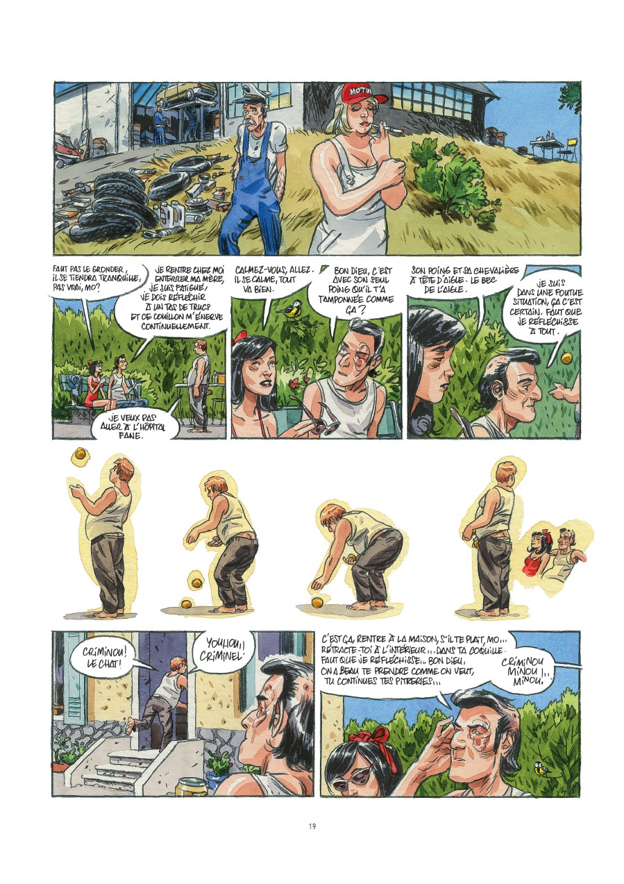 Enfin, le dessin de Jean-Christophe Chauzy lie et sublime l’ensemble. Ses magnifiques aquarelles font cohabiter des couleurs chaudes et des faciès cassés. La luxuriance de la végétation est un contrepoint au désir charnel traversant l’album. L’obscurité du garage des Voke renvoie à la noirceur des âmes, la lumière crue rend palpable la température excessive et l’atmosphère oppressante, qui exacerbent les systèmes nerveux et fatiguent les patiences.
